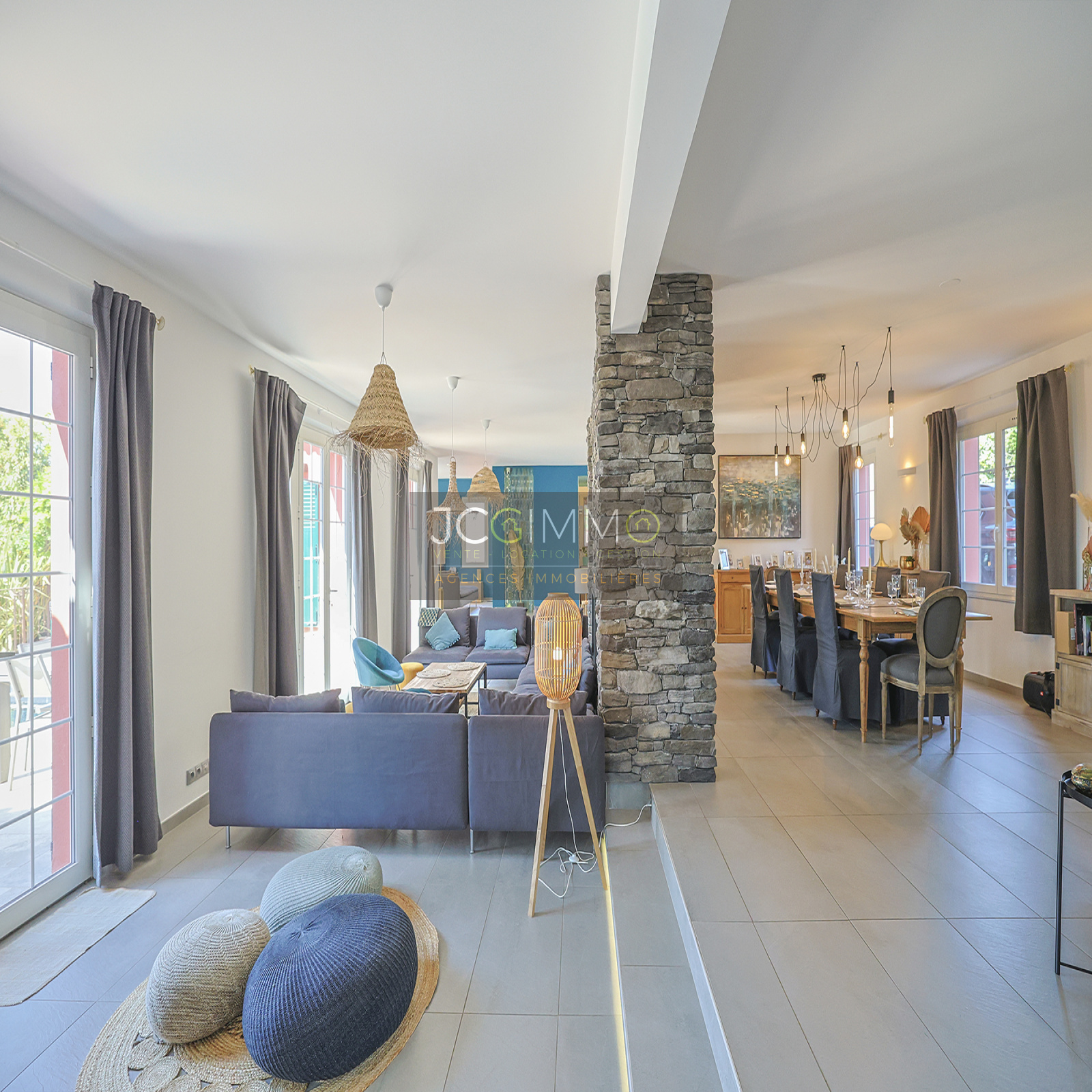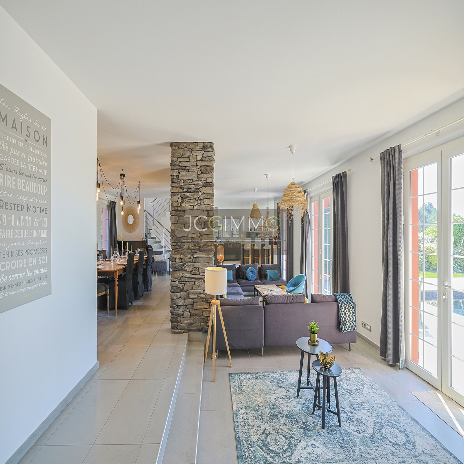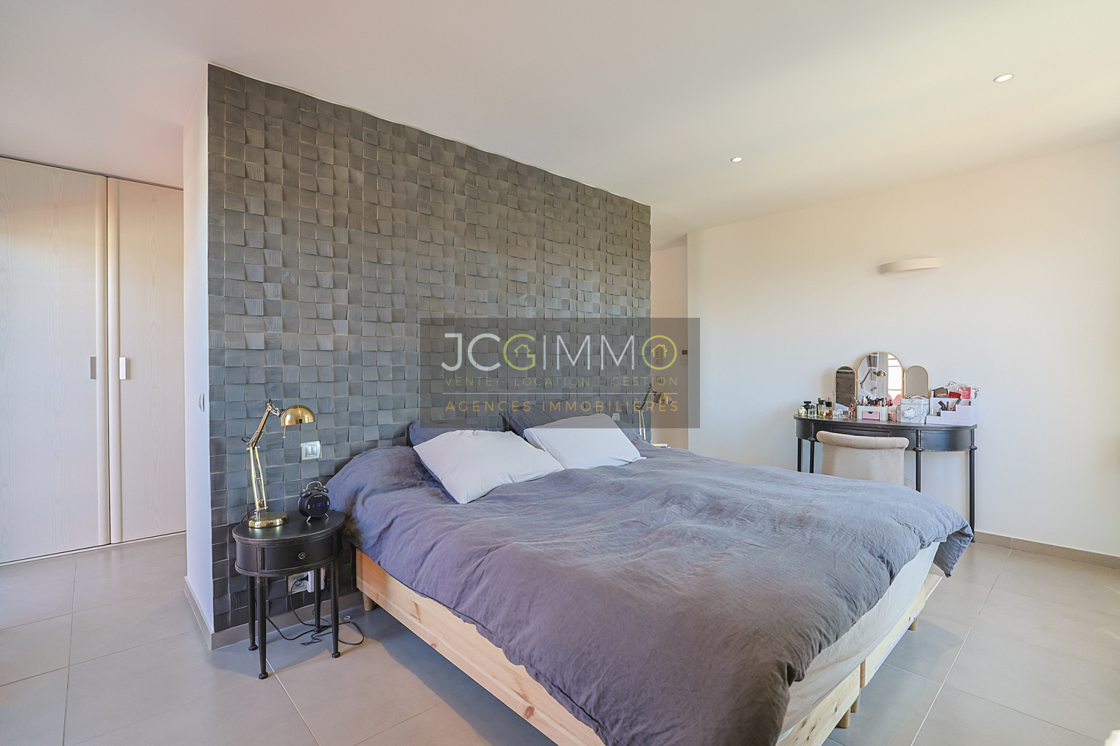 Plot of land with a surface area of 2142m², very well landscaped and planted with trees, with a lovely unobstructed view all the way to the sea. Enjoy the sunny days thanks to the 9m x 5m heated swimming pool. The terraces provide friendly spaces for outdoor dining or simply relaxing while admiring the garden surrounding the property. An automatic watering system ensures greenery in the garden all year round thanks to drilling.