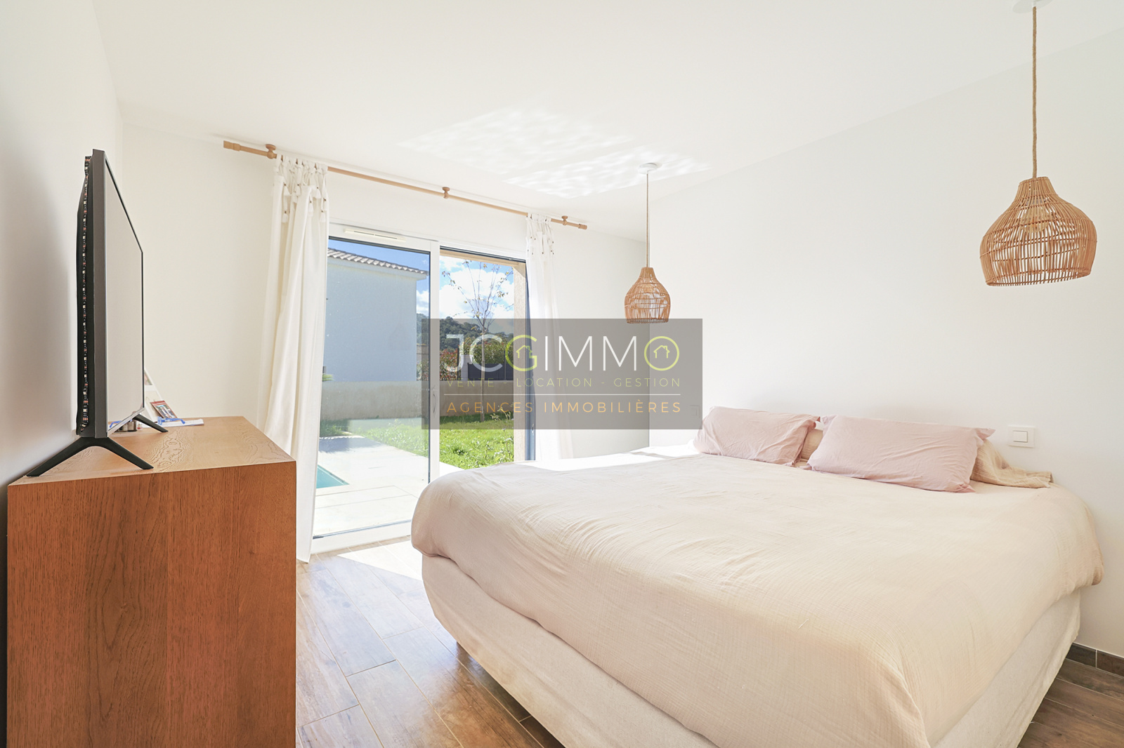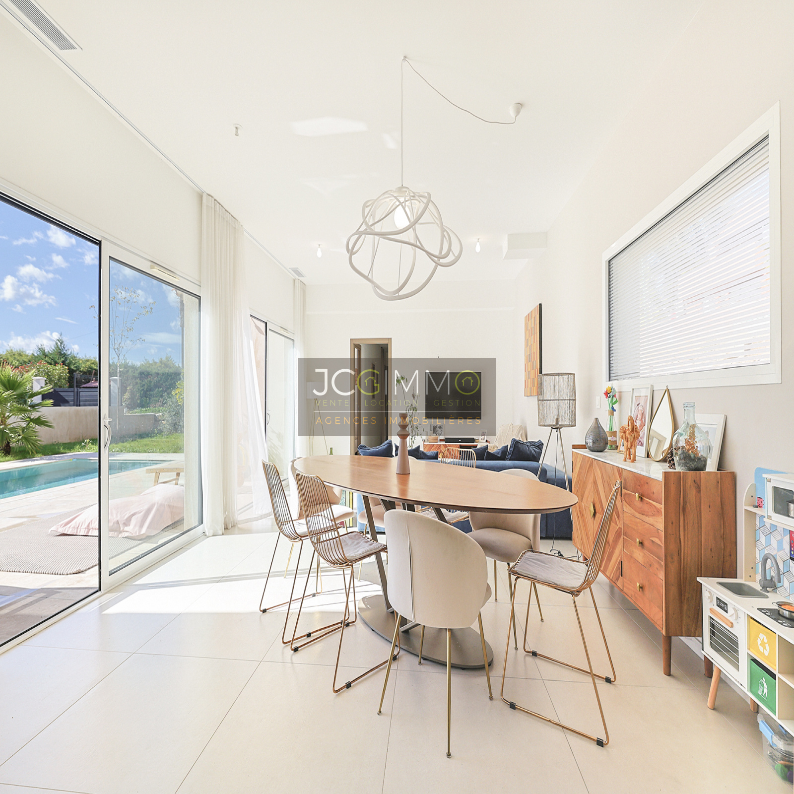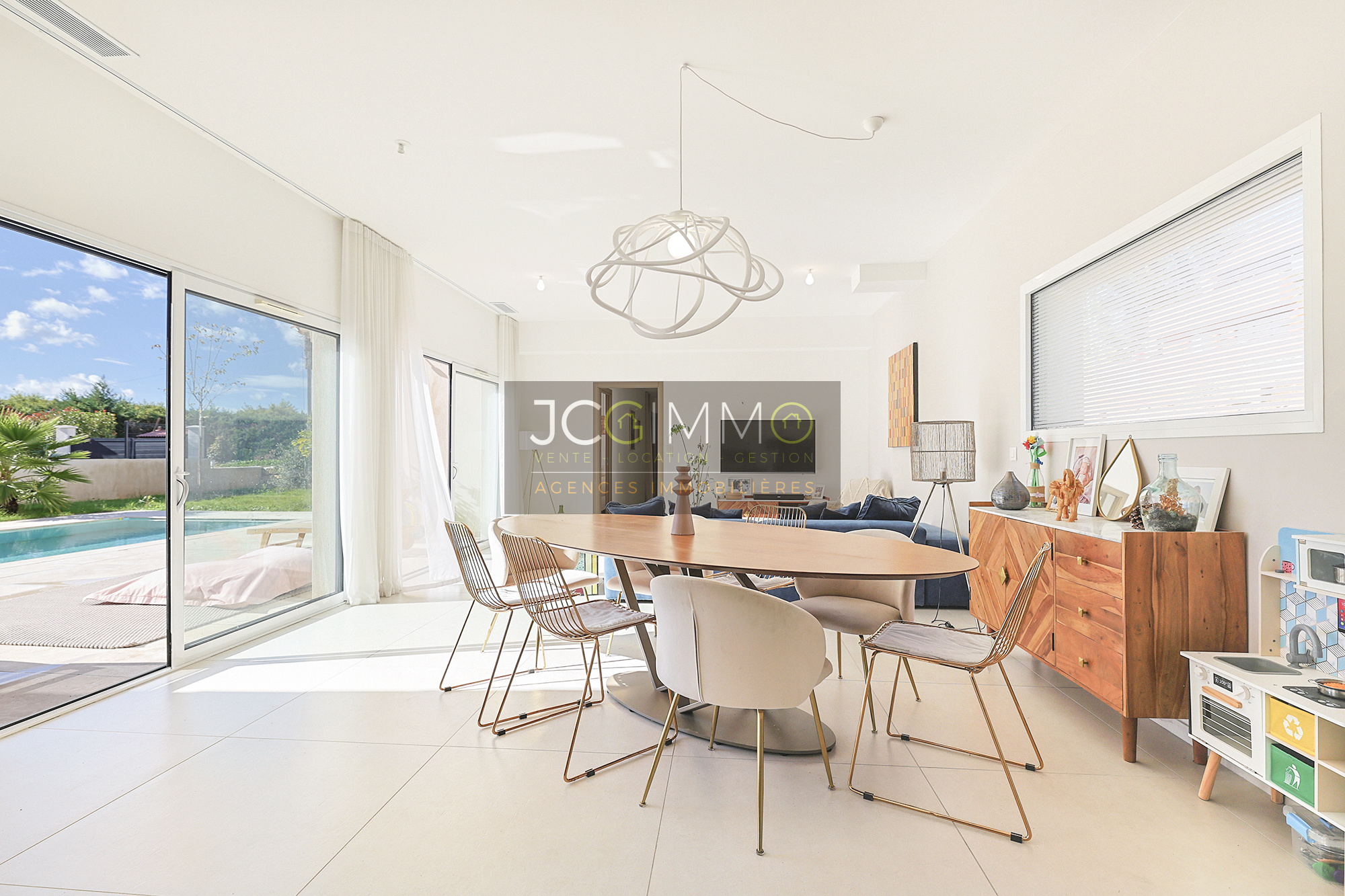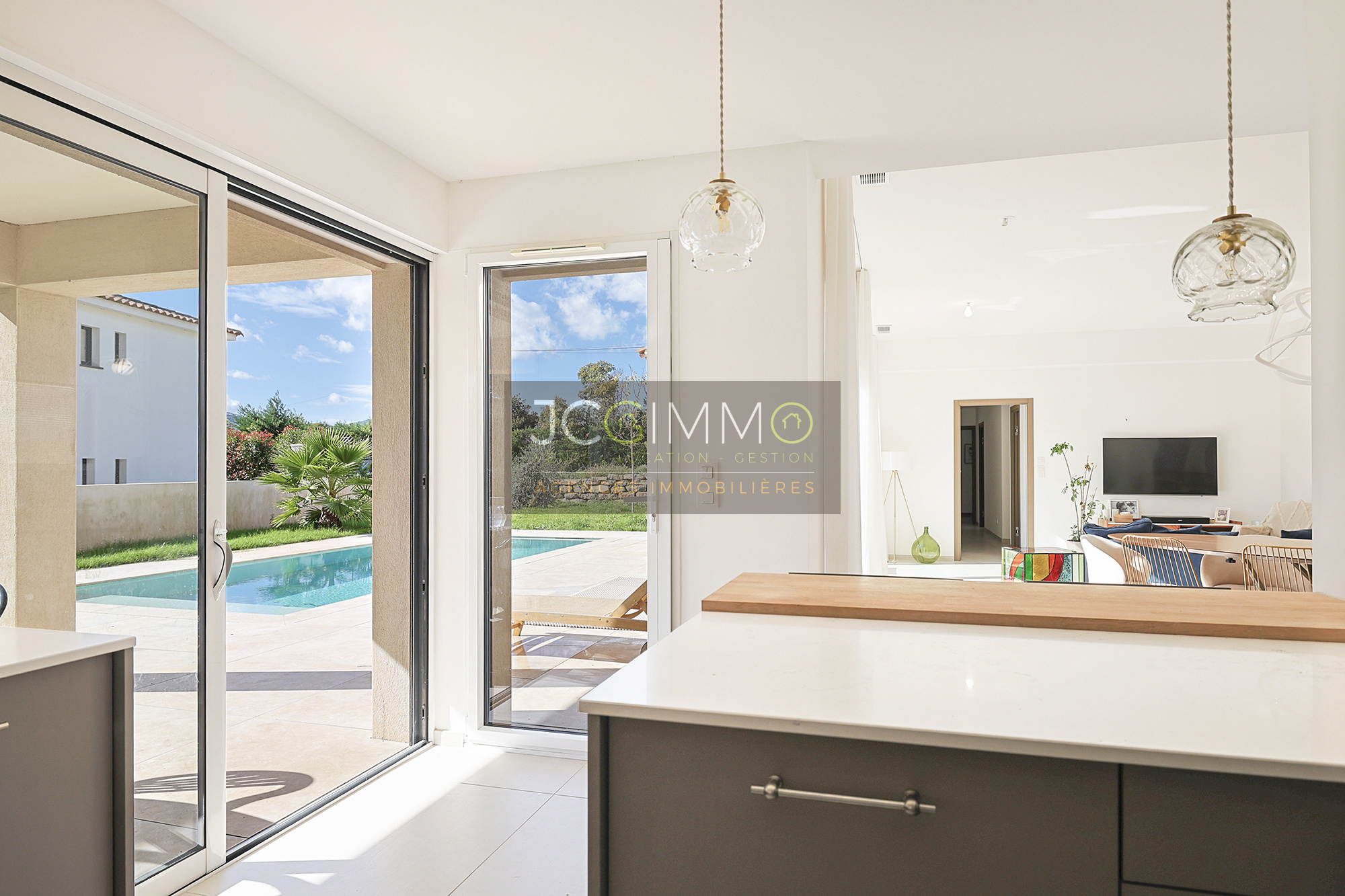 À l'intérieur : une entrée avec placard et WC, s'ouvrant sur une pièce de vie lumineuse avec cuisine équipée pour une surface totale de 57 m², l'ensemble bénéficiant de baies vitrées donnant sur une terrasse avec piscine.