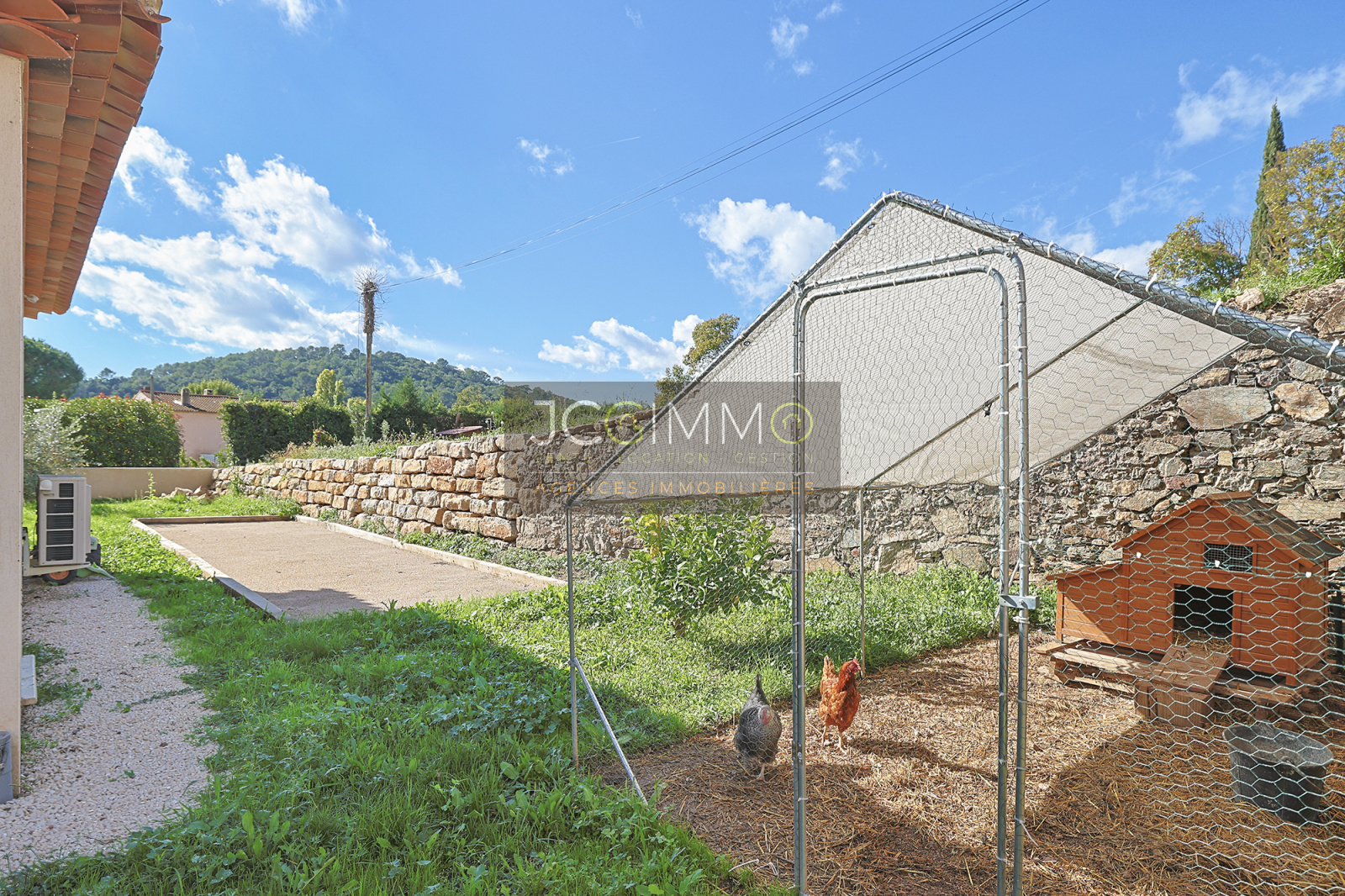À l'extérieur : un terrain plat de 890 m² avec piscine traditionnelle 3,5/7,5 (traitement sel), terrasse et terrasse couverte, communiquant avec la maison un garage de 29m² avec espace buanderie, un terrain de pétanque, du stationnement et l'arrosage automatique, relié au canal des arrosant.