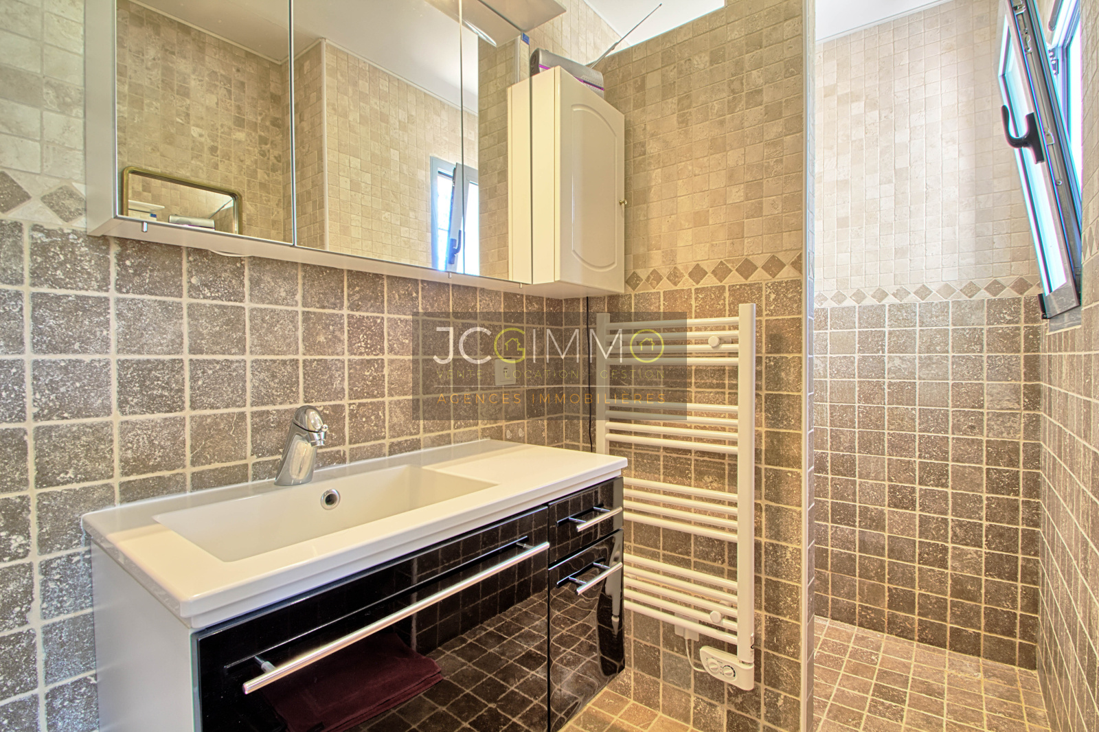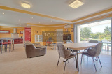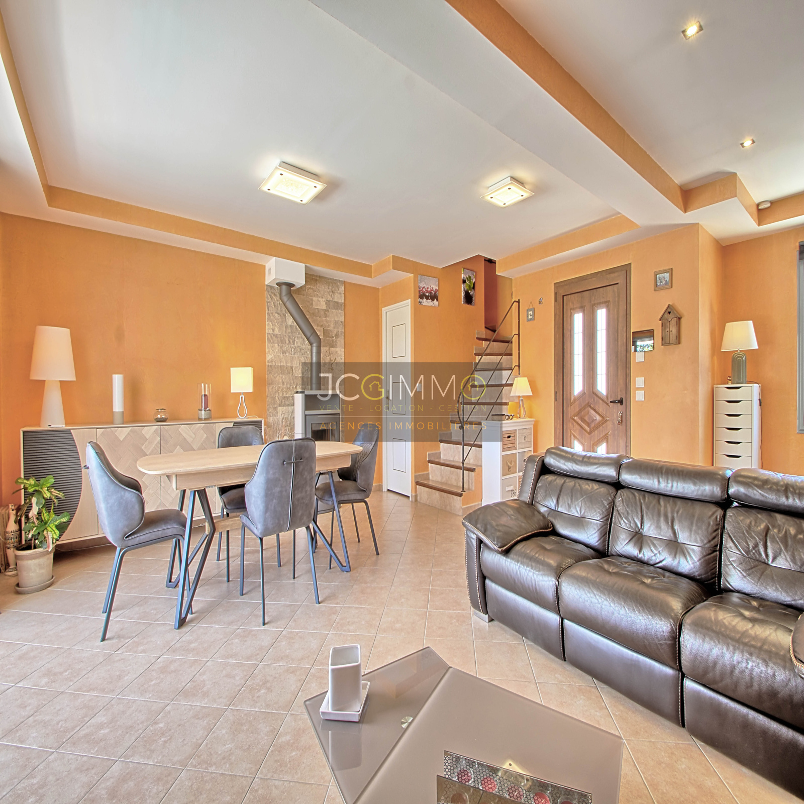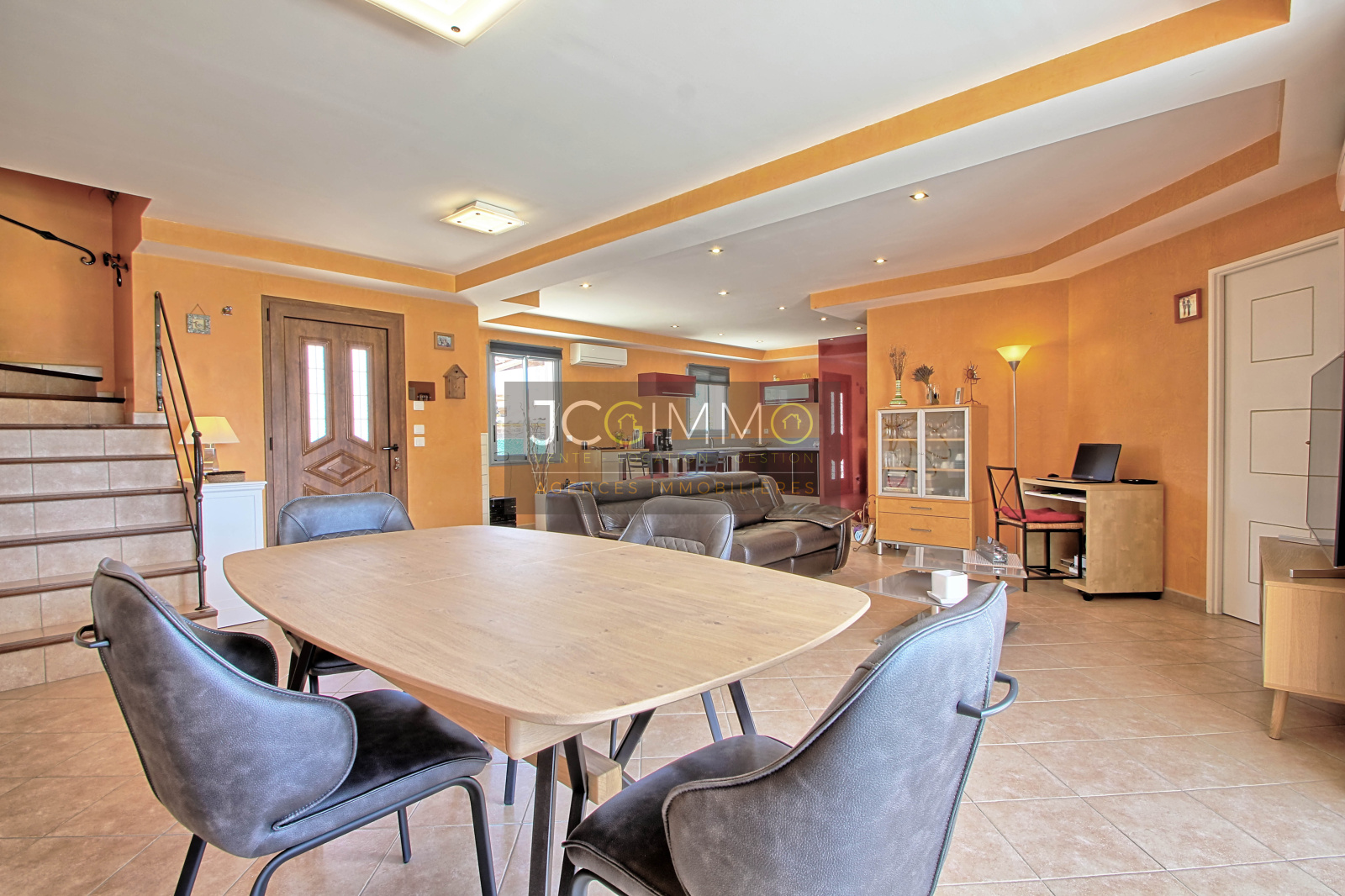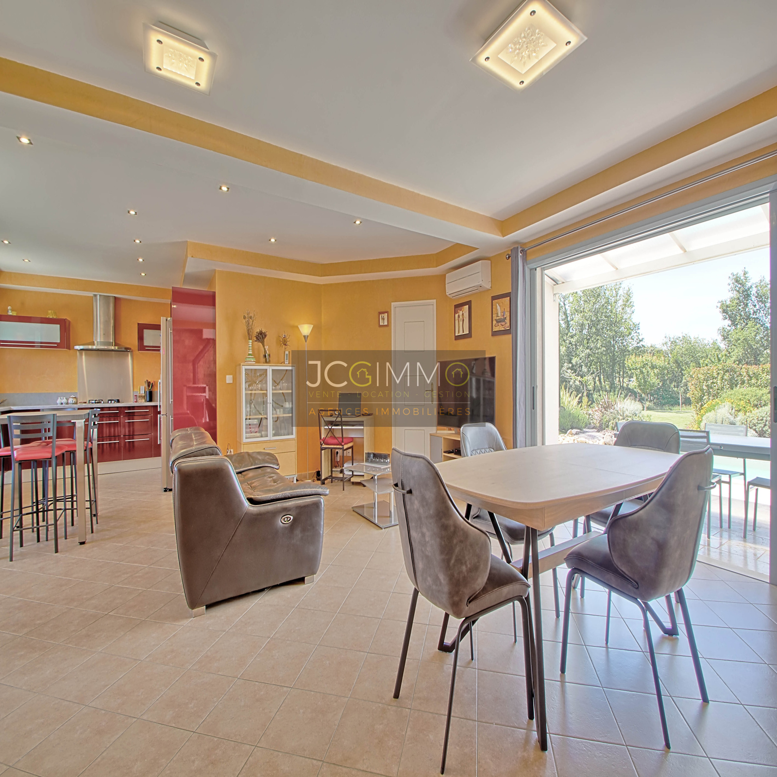 L'espace de vie de 60m² env très lumineux, orienté plein sud et totalement ouvert, intègre une très belle cuisine aménagée, une salle à manger et un salon, le tout agrémenté d'une belle baie vitrée à galandage donnant sur la piscine et sa terrasse en travertin.