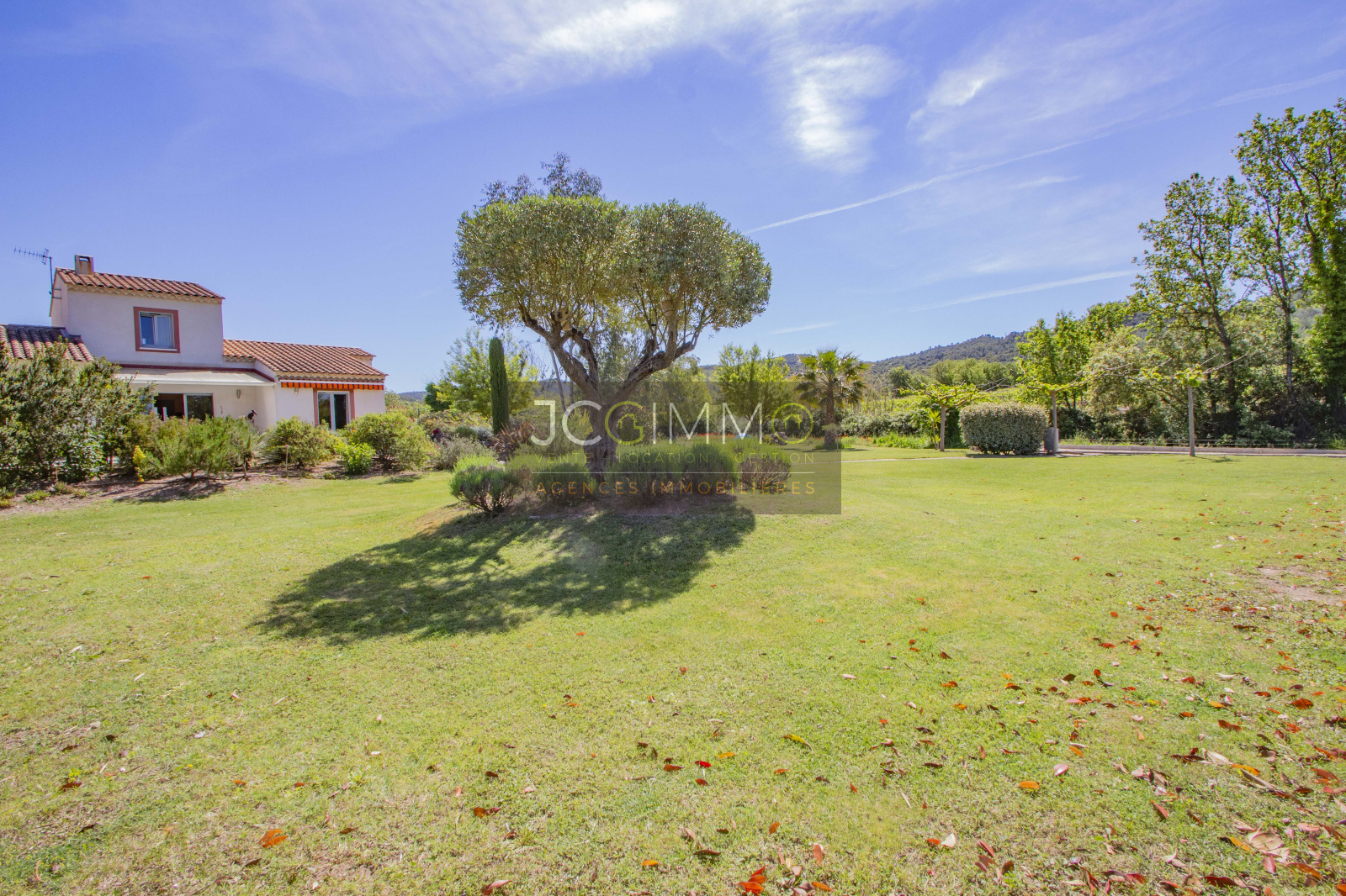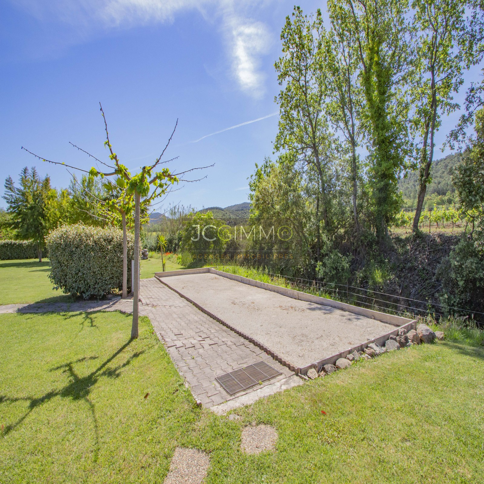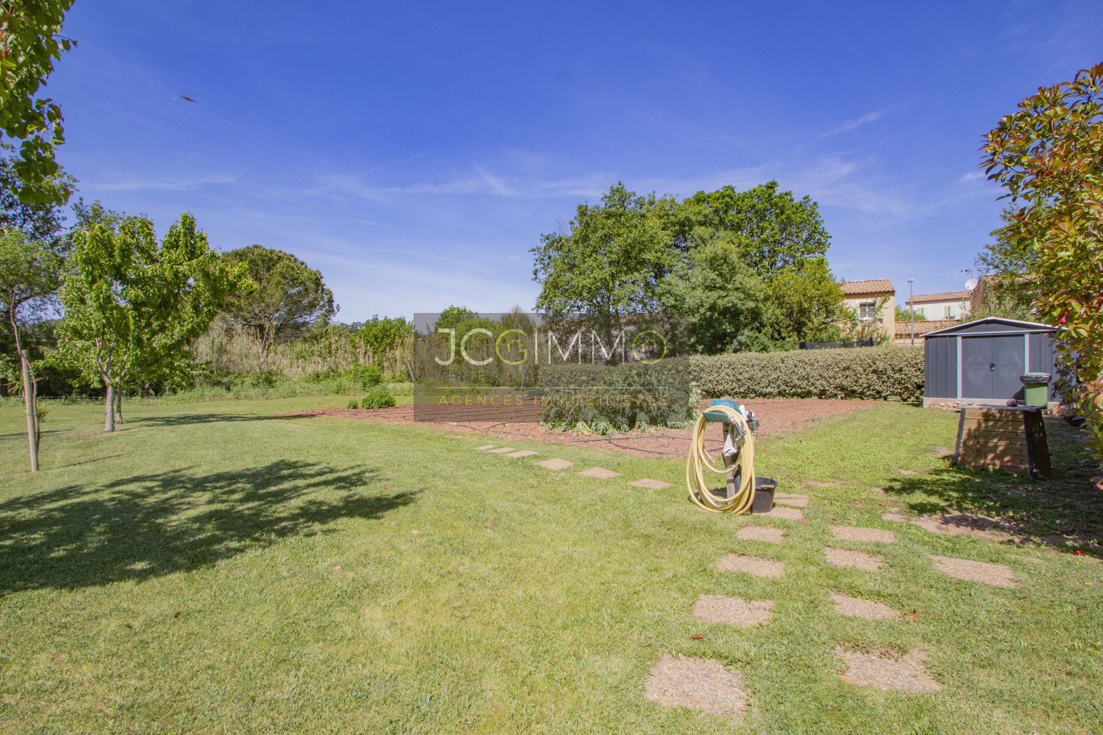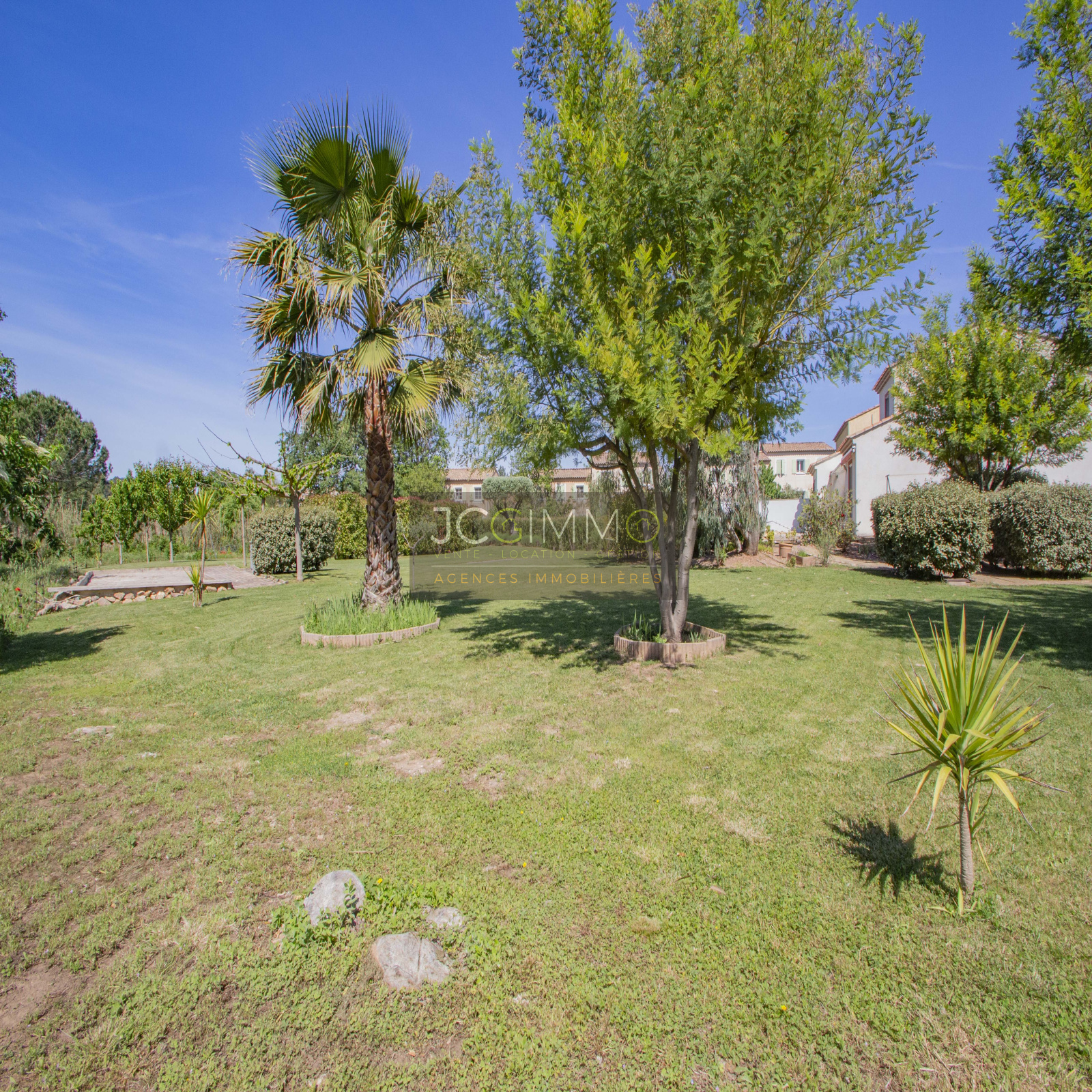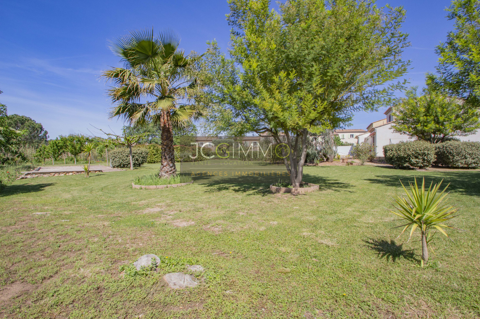Le terrain, de 2700 m² totalement plat, parfaitement arboré (olivier, palmier, mimosas...) aménagé avec piscine, terrasse en travertin (entrée et côté piscine), terrain de pétanque, potager, abris de jardin, Garage de 35m² avec porte motorisée et fenêtre, aménageables partiellement ou totalement en pièces habitables...