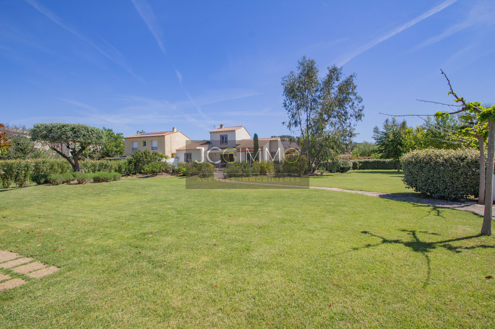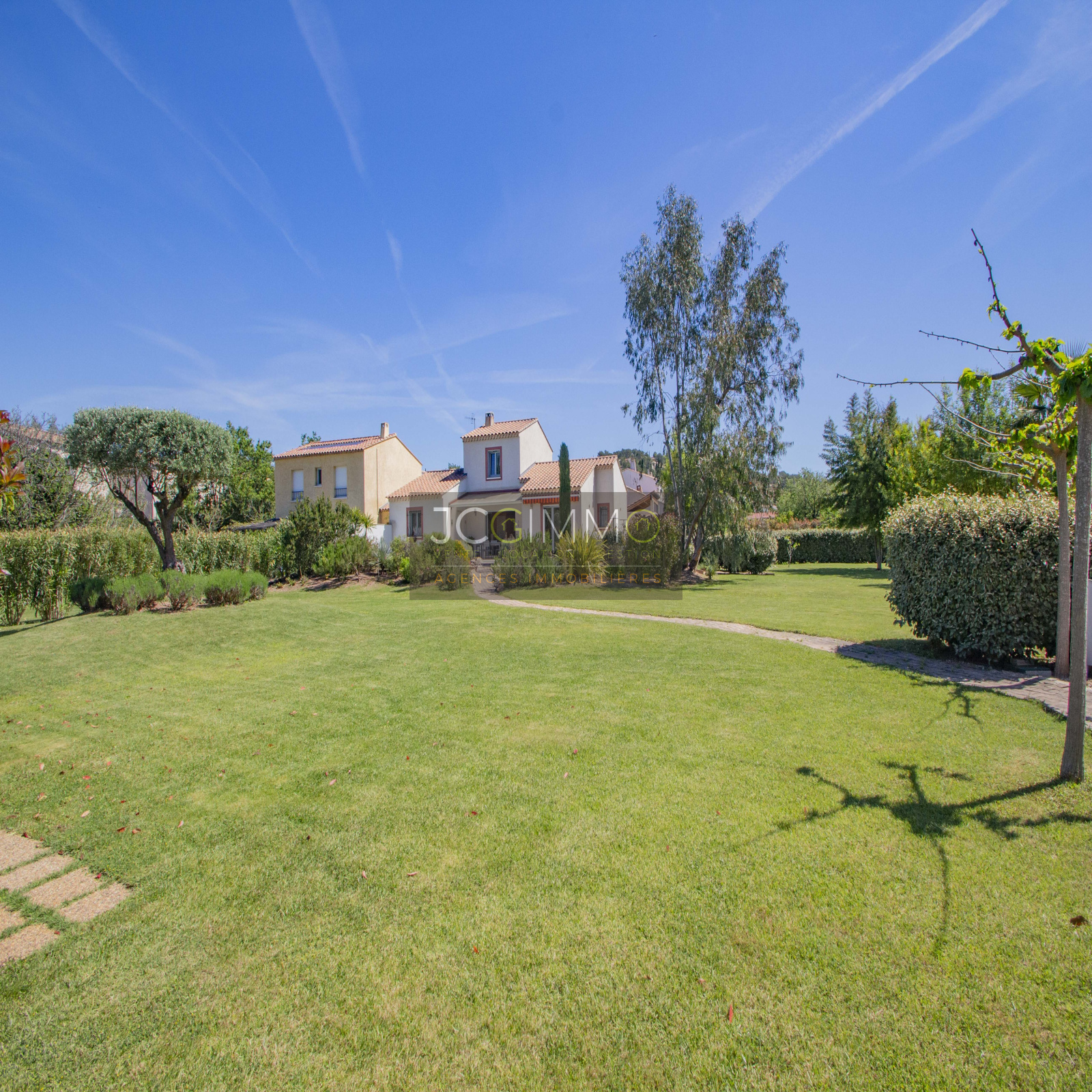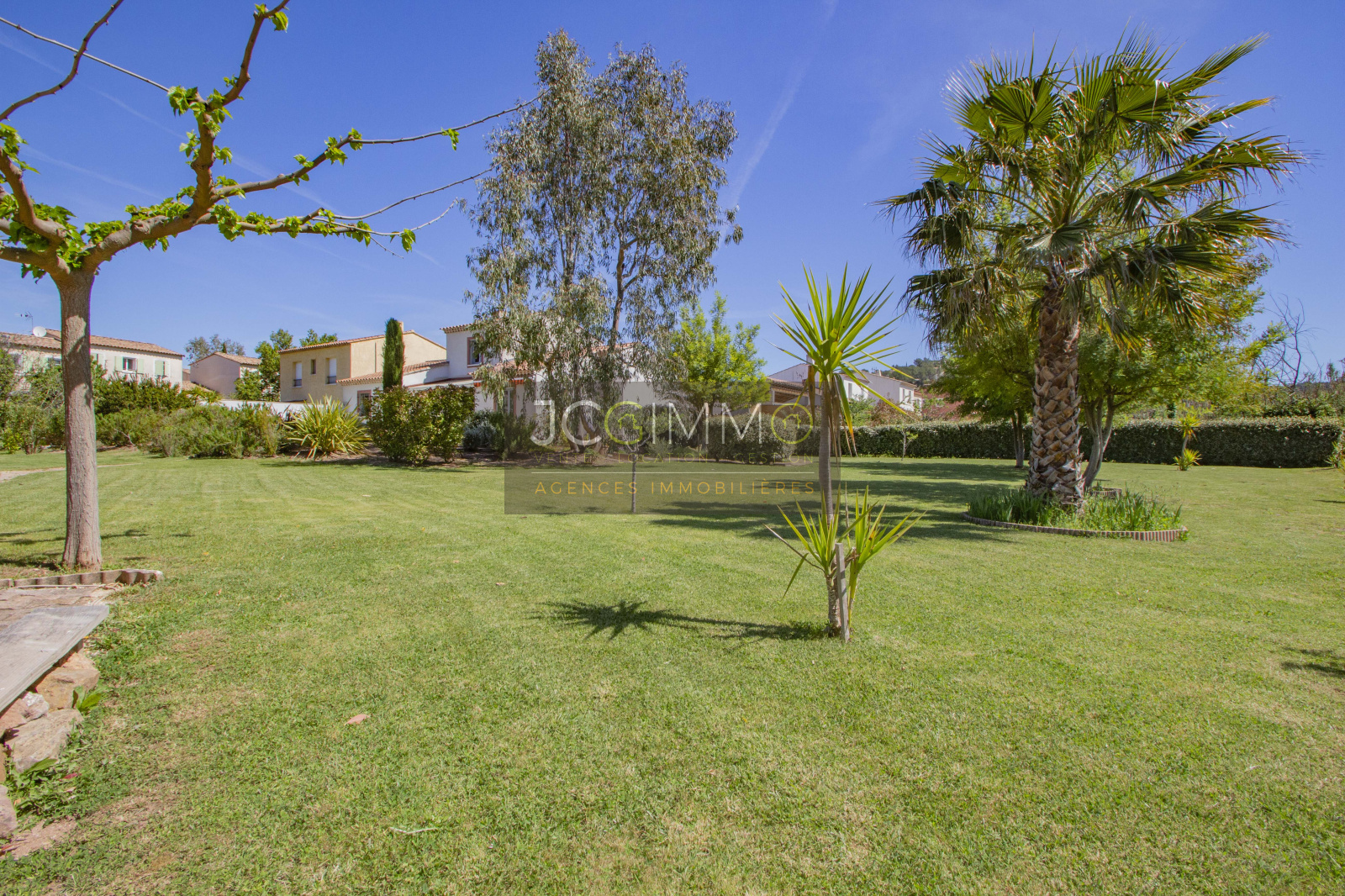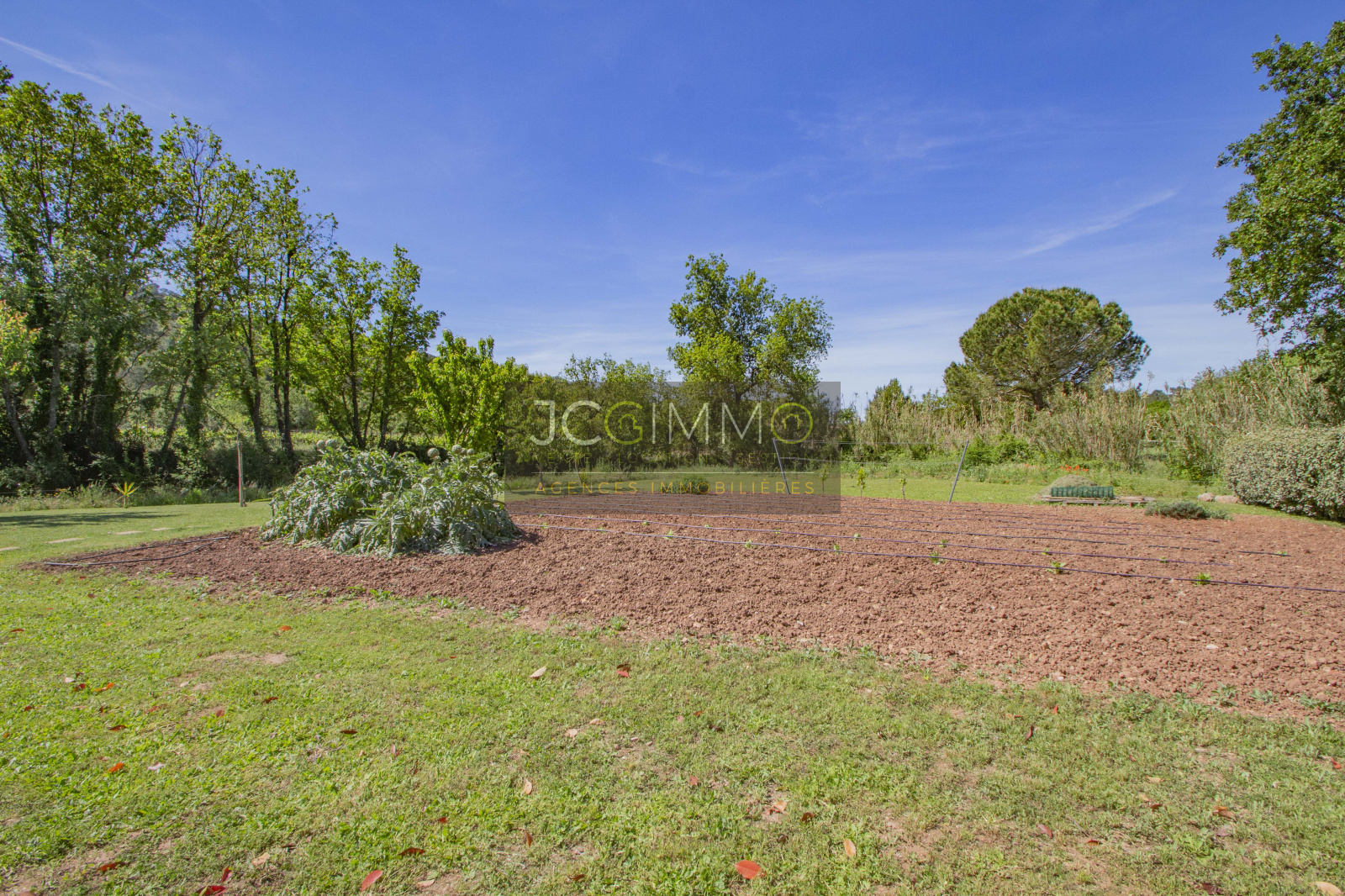 Le terrain, de 2700 m² totalement plat, parfaitement arboré (olivier, palmier, mimosas...) aménagé avec piscine, terrasse en travertin (entrée et côté piscine), terrain de pétanque, potager, abris de jardin, Garage de 35m² avec porte motorisée et fenêtre, aménageables partiellement ou totalement en pièces habitables...