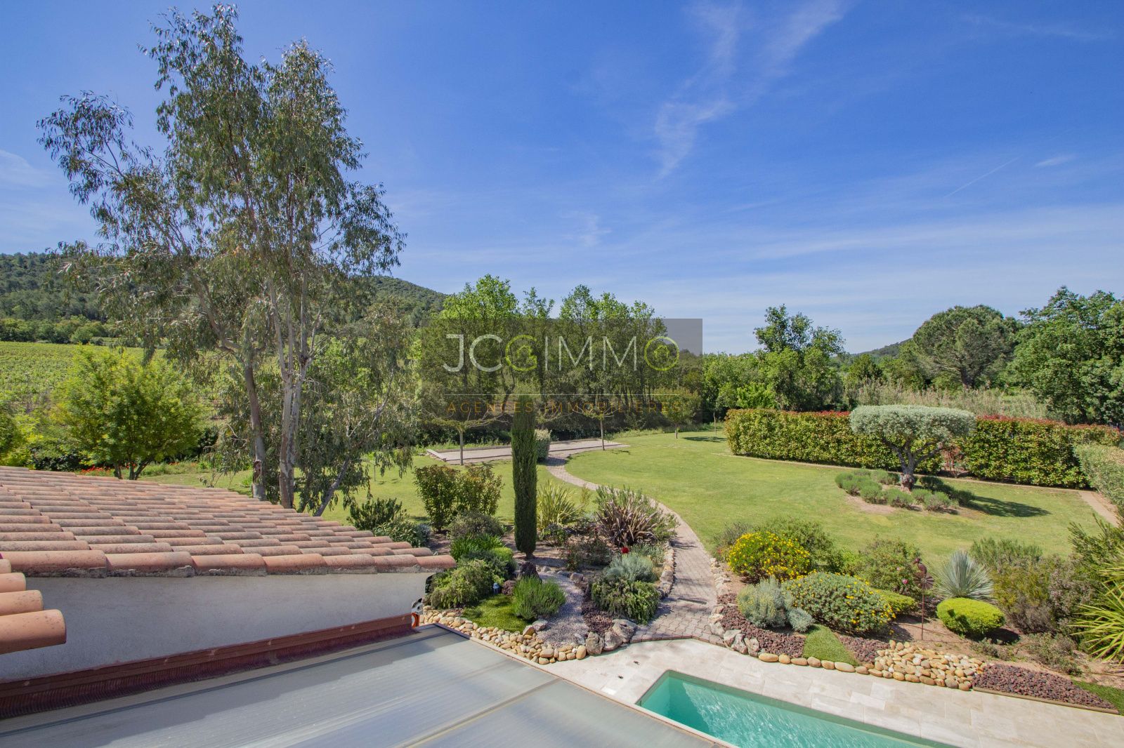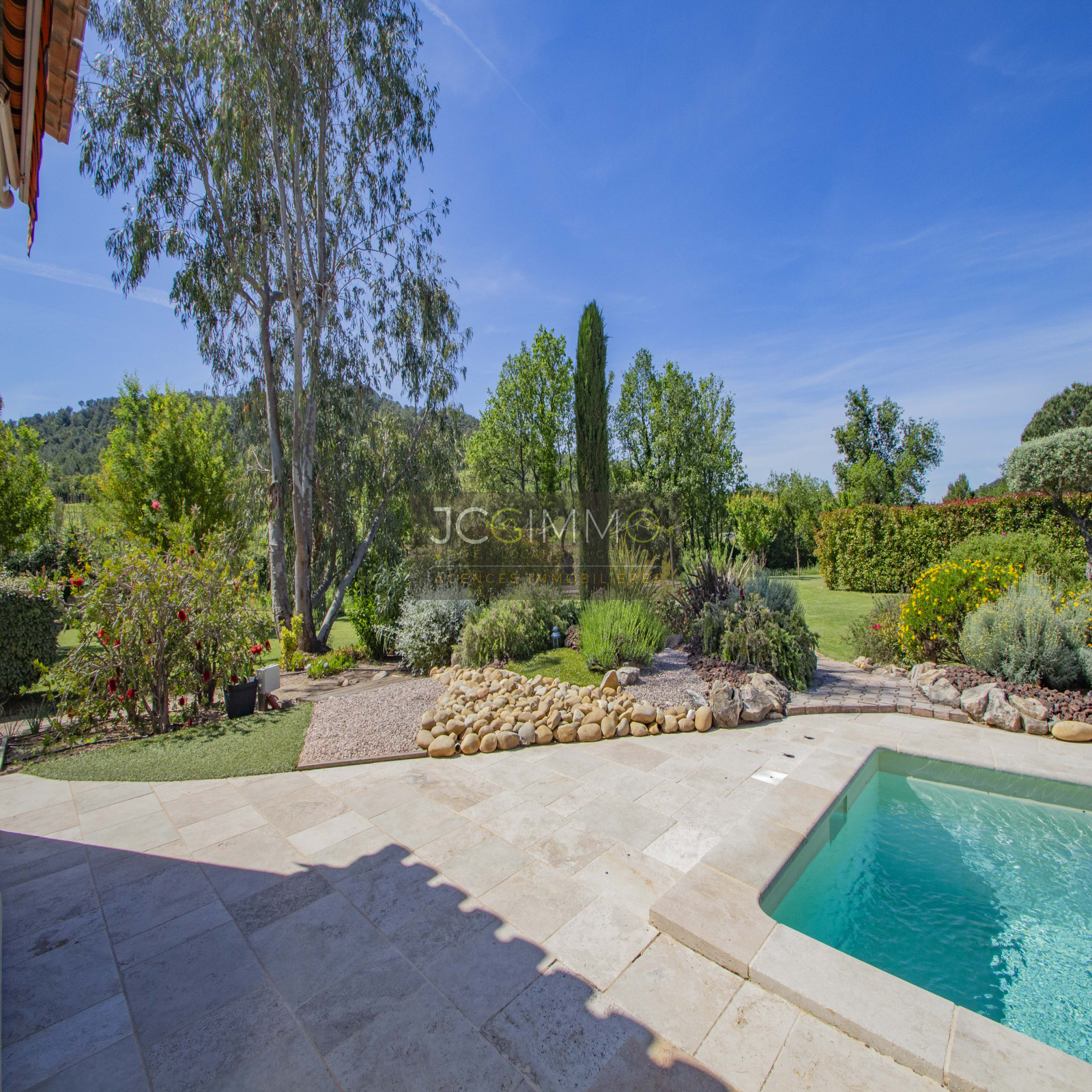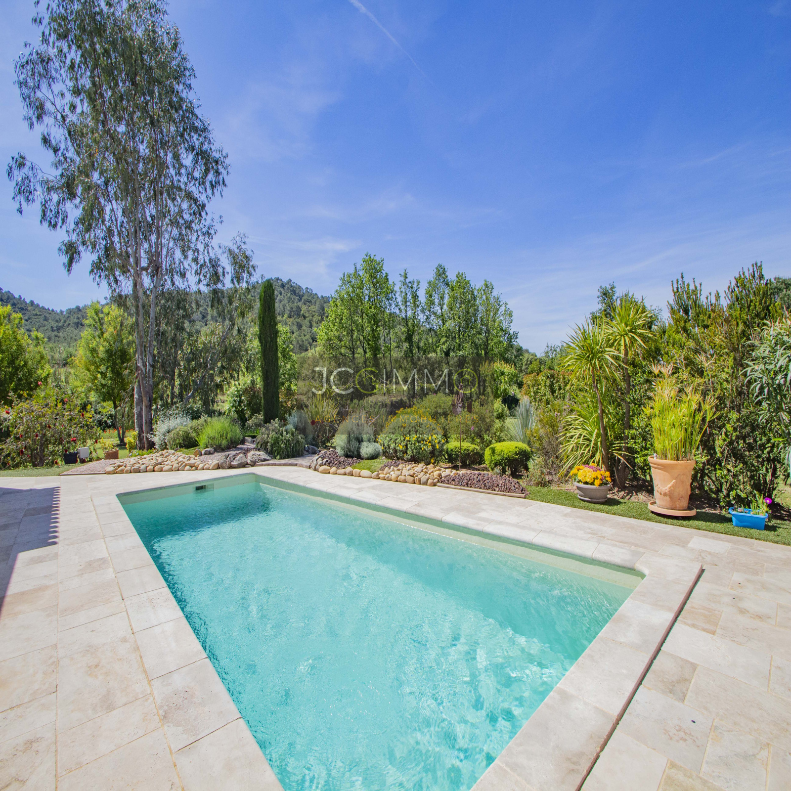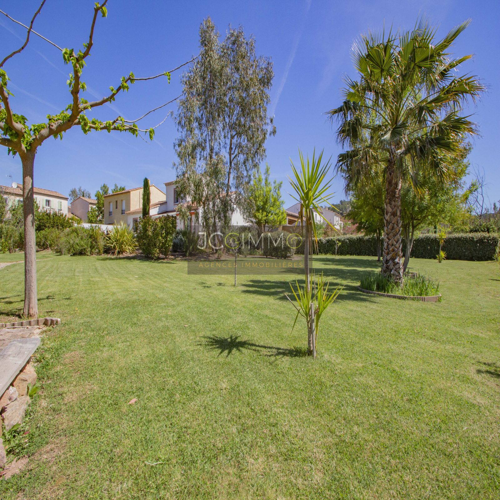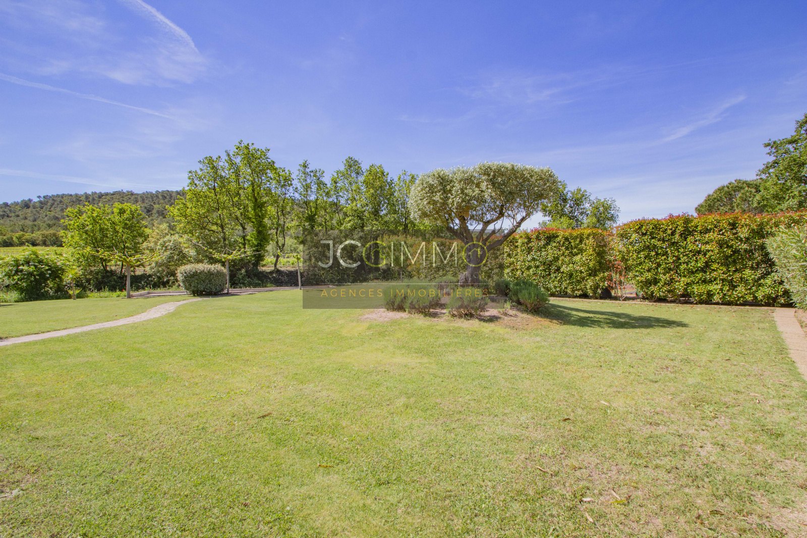 Le terrain, de 2700 m² totalement plat, parfaitement arboré (olivier, palmier, mimosas...) aménagé avec piscine, terrasse en travertin (entrée et côté piscine), terrain de pétanque, potager, abris de jardin, Garage de 35m² avec porte motorisée et fenêtre, aménageables partiellement ou totalement en pièces habitables...