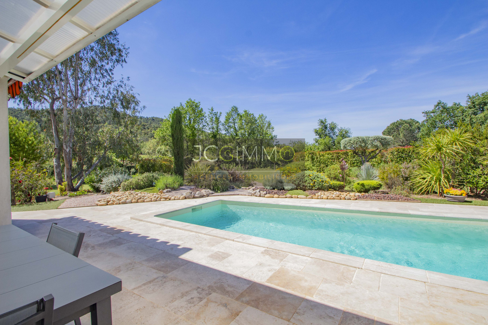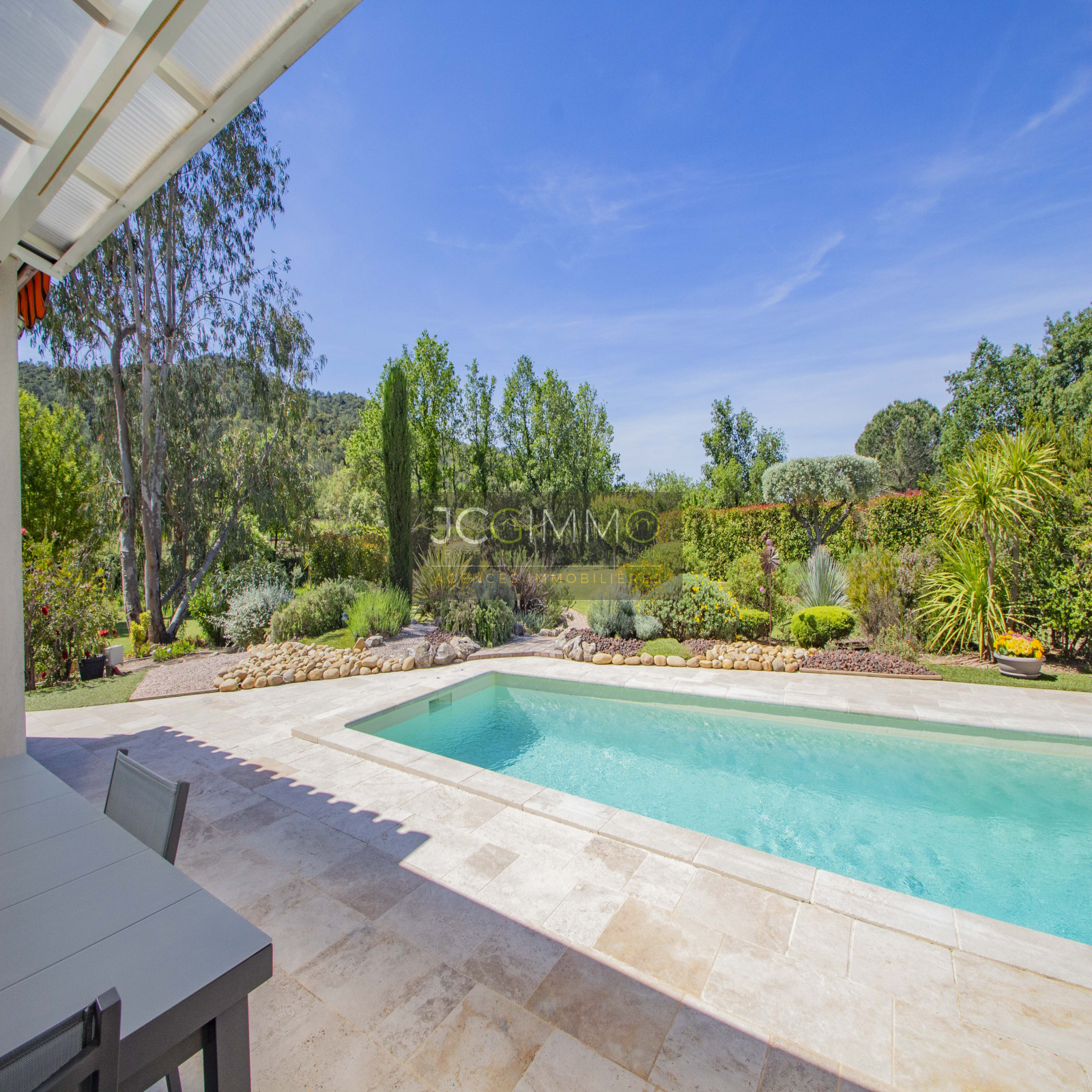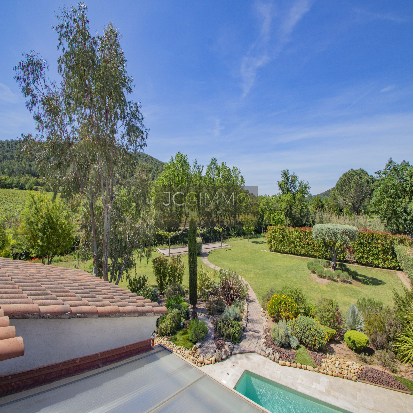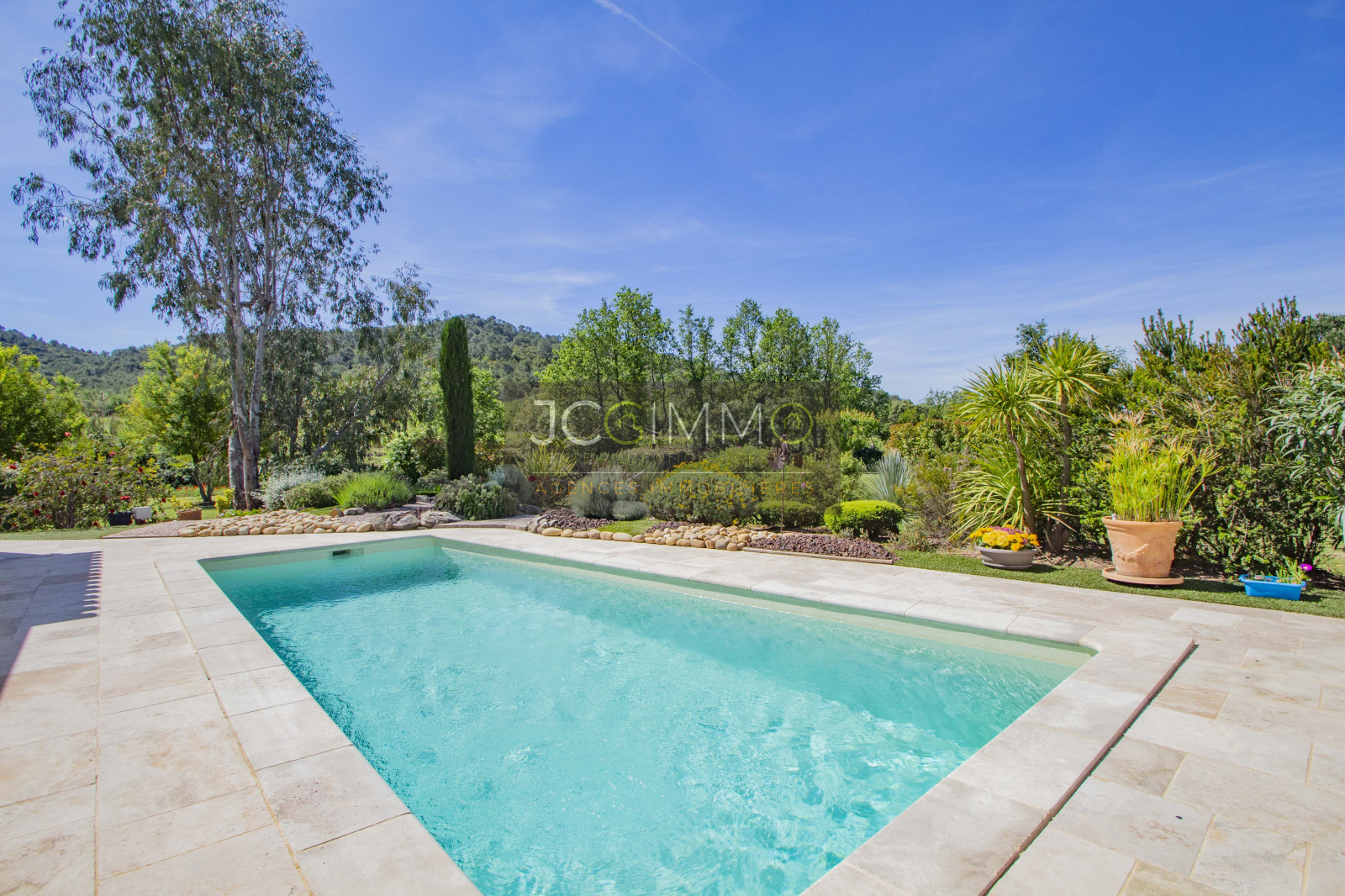Le terrain, de 2700 m² totalement plat, parfaitement arboré (olivier, palmier, mimosas...) aménagé avec piscine, terrasse en travertin (entrée et côté piscine), terrain de pétanque, potager, abris de jardin, Garage de 35m² avec porte motorisée et fenêtre, aménageables partiellement ou totalement en pièces habitables...