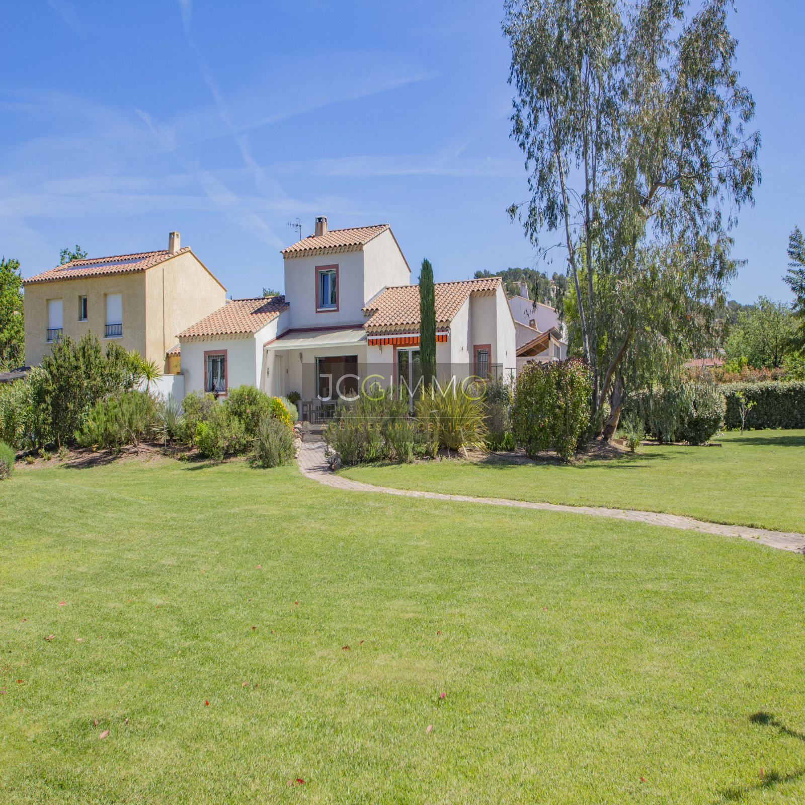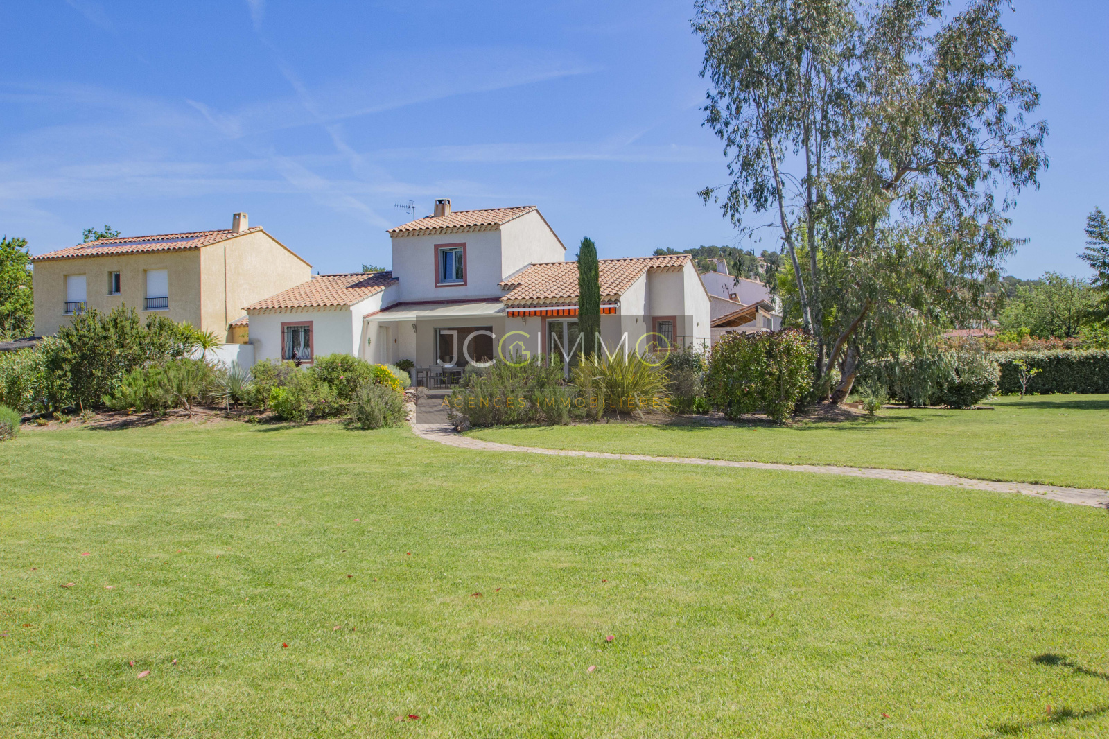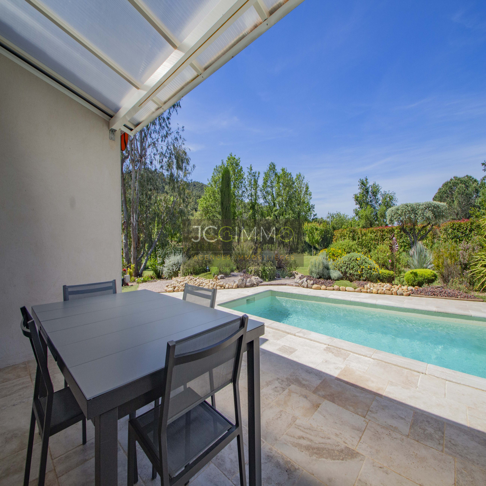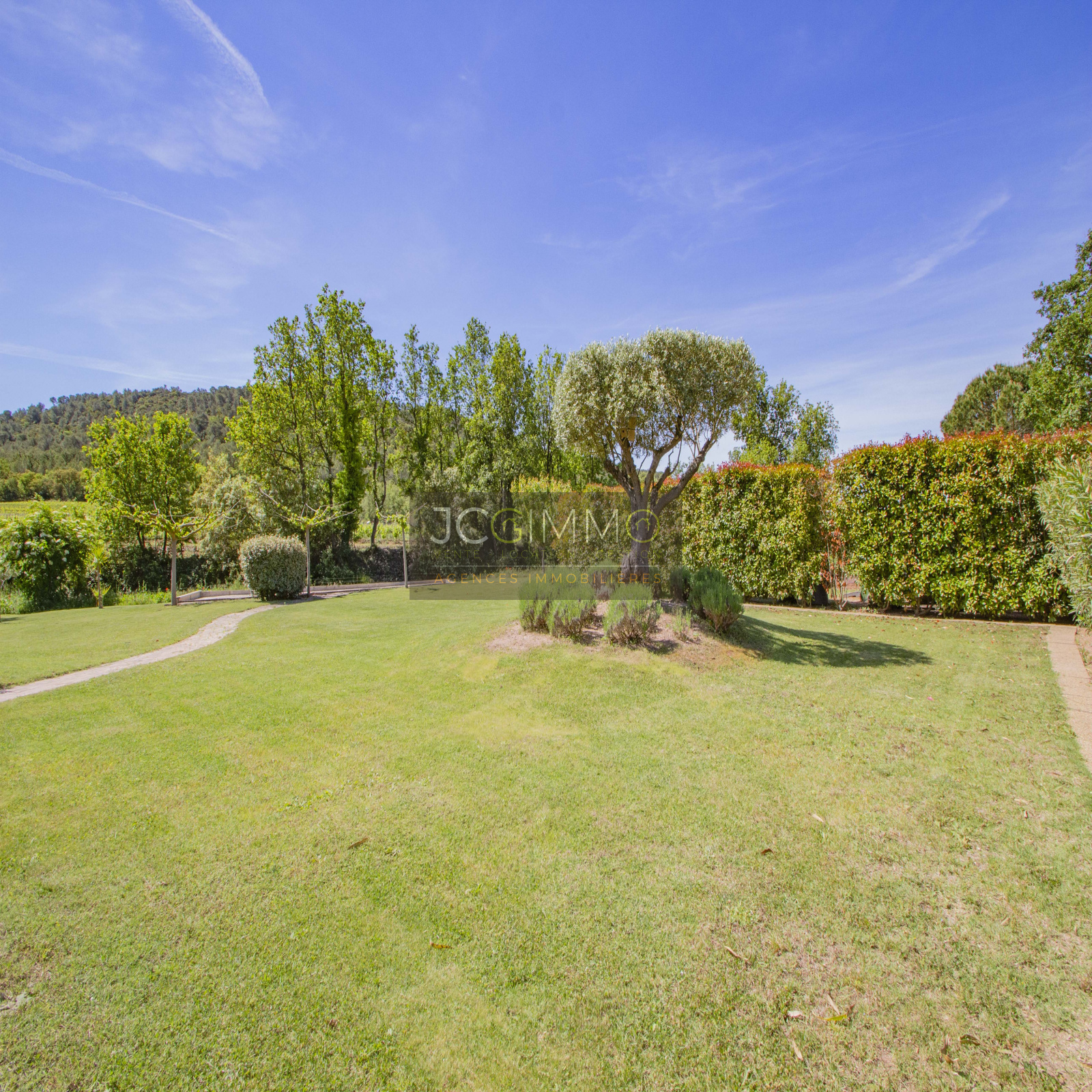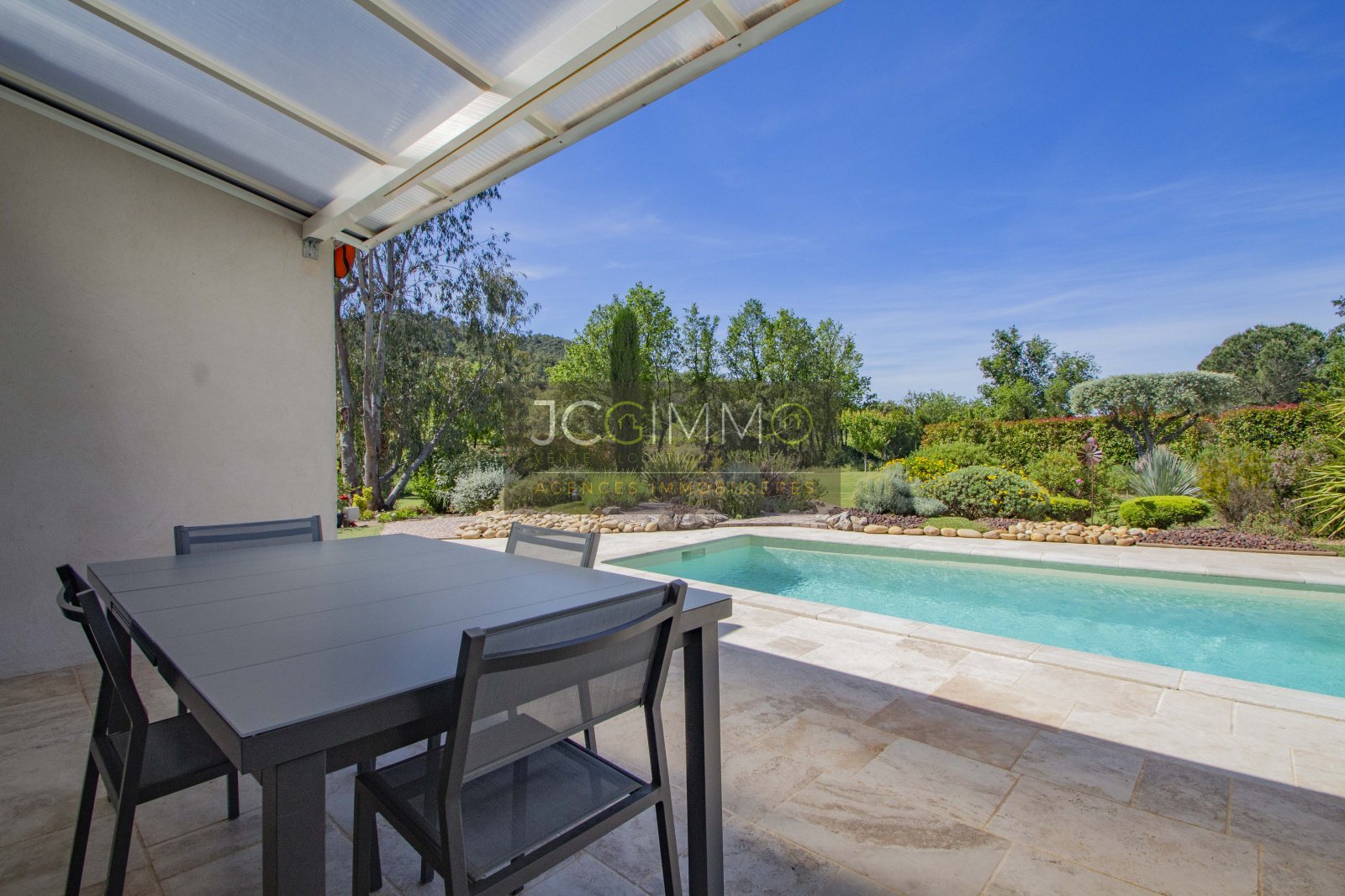 Le terrain, de 2700 m² totalement plat, parfaitement arboré (olivier, palmier, mimosas...) aménagé avec piscine, terrasse en travertin (entrée et côté piscine), terrain de pétanque, potager, abris de jardin, Garage de 35m² avec porte motorisée et fenêtre, aménageables partiellement ou totalement en pièces habitables...