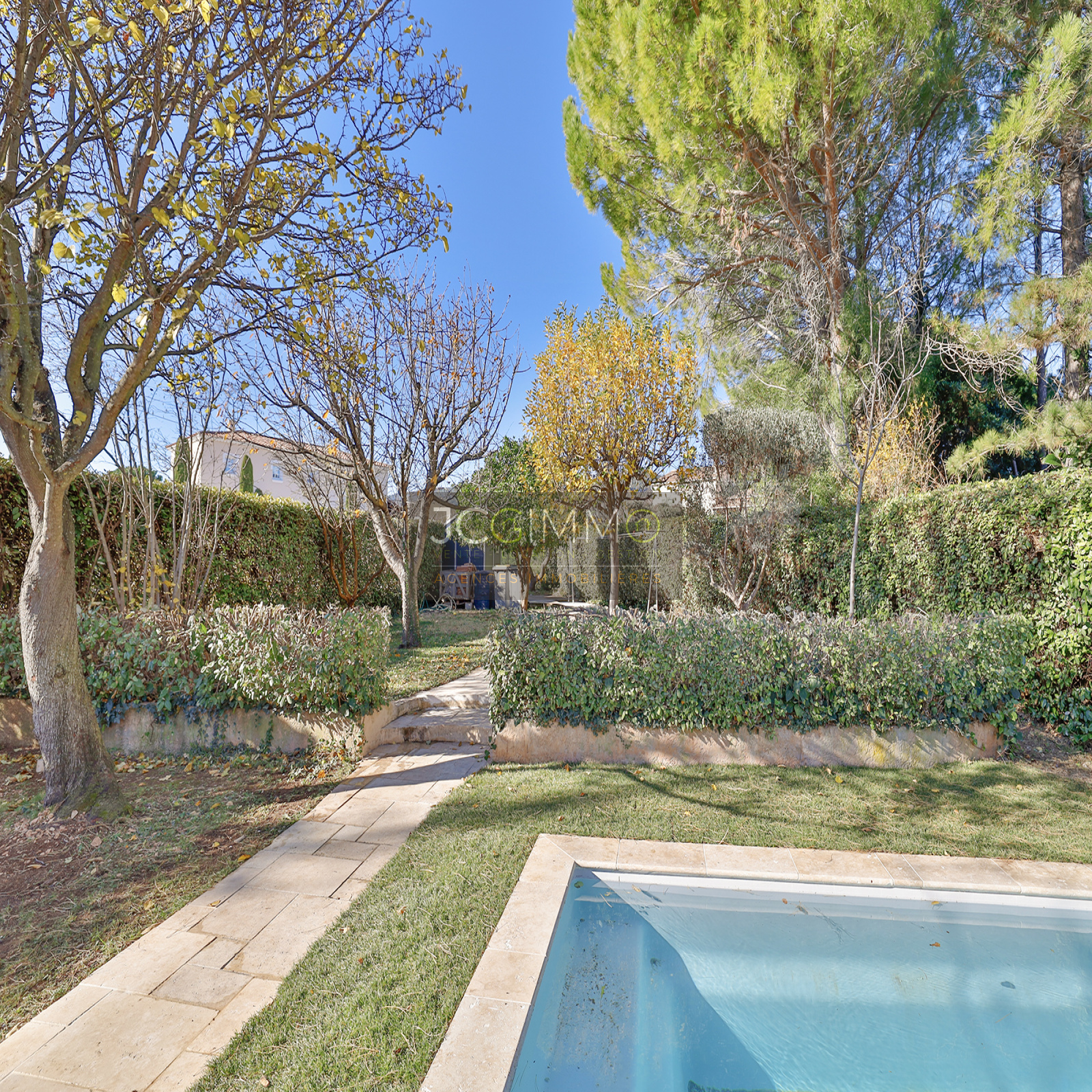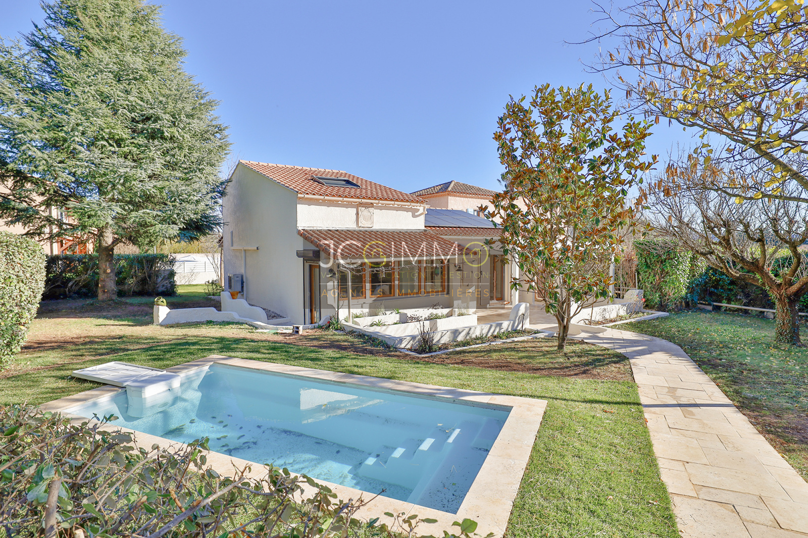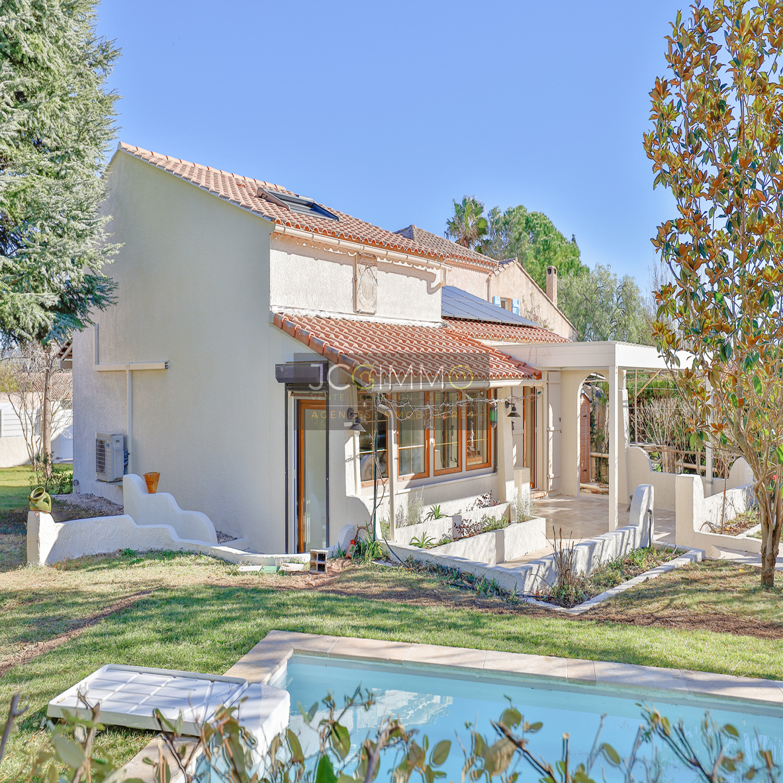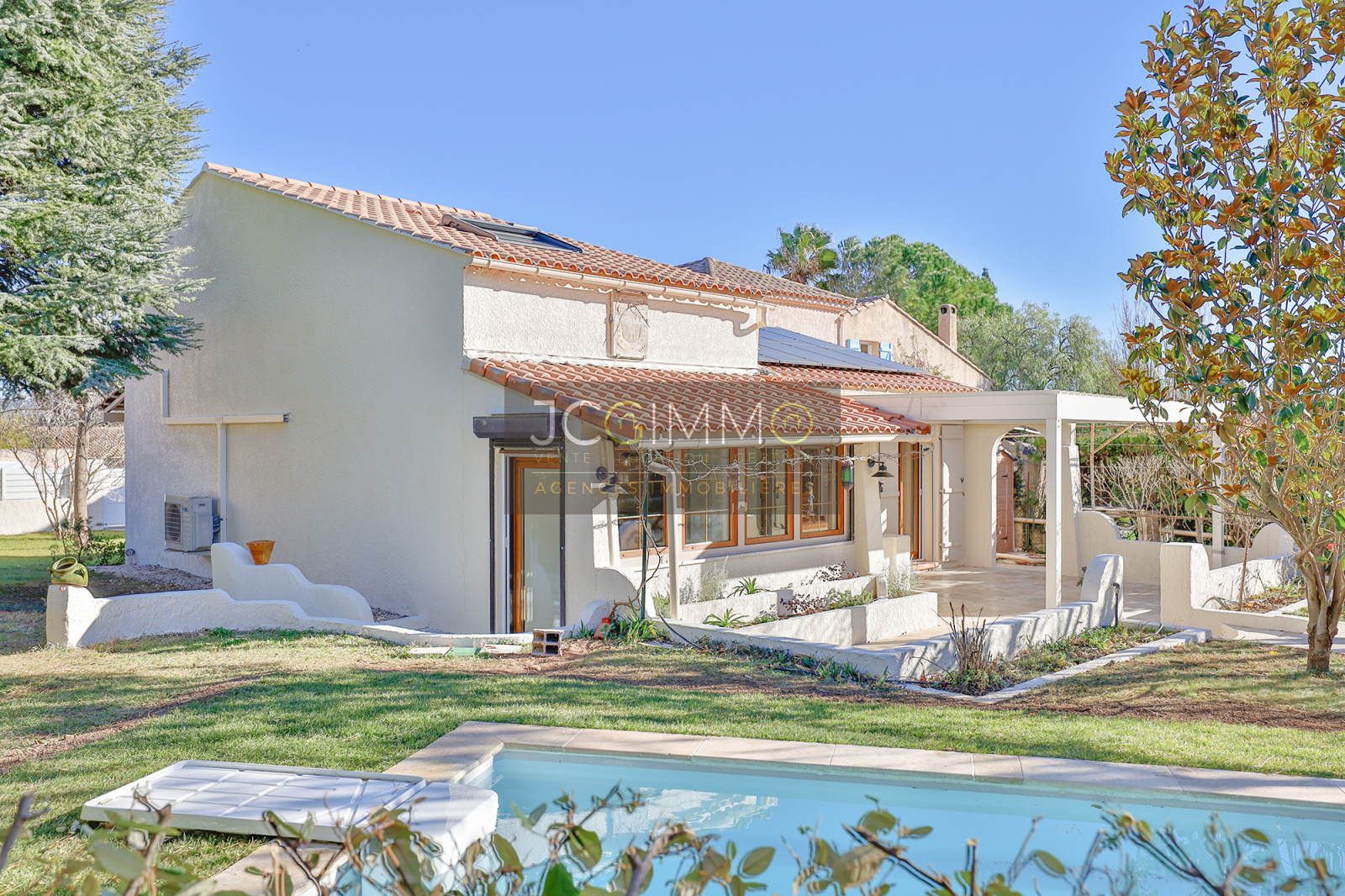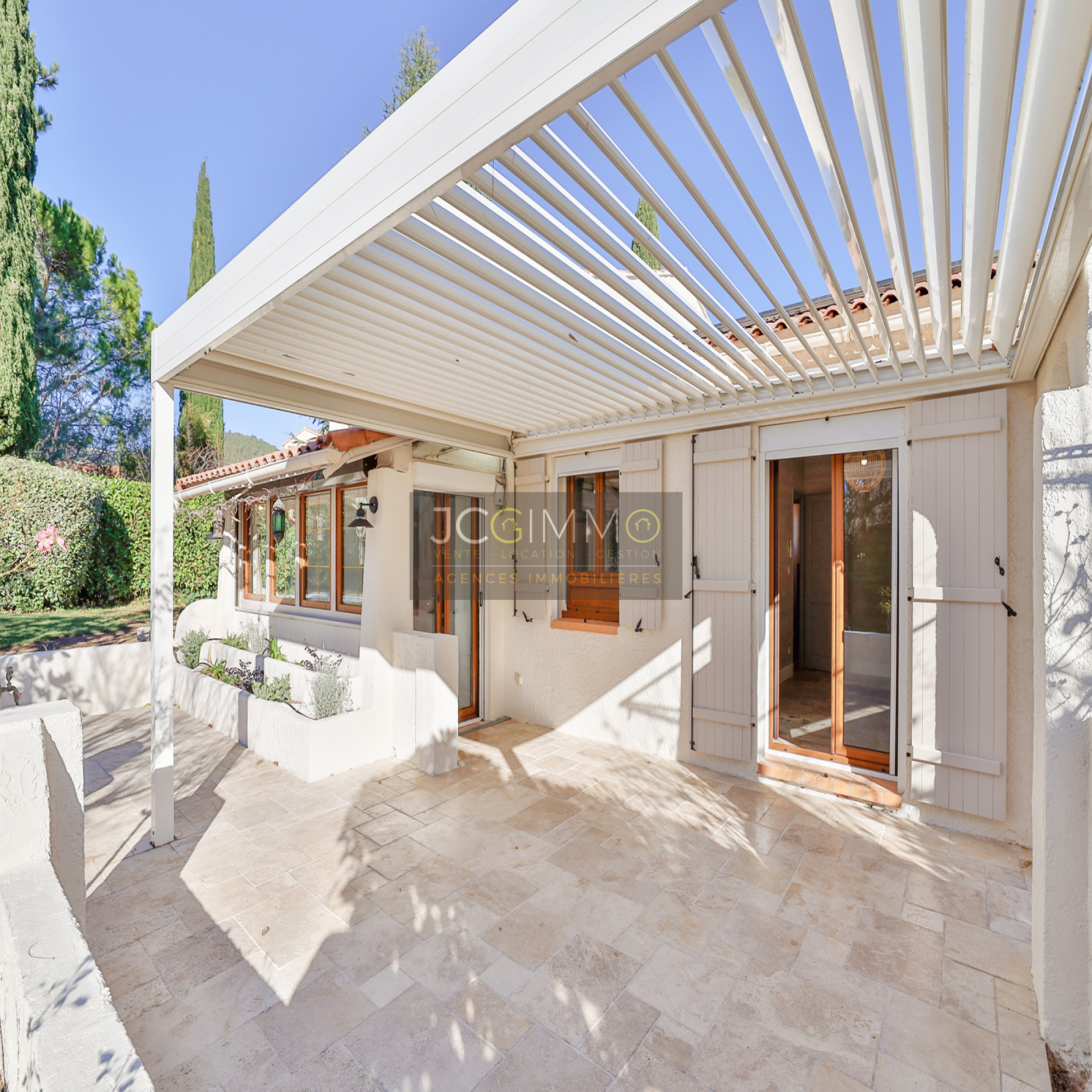 À l'extérieur, appréciez la terrasse avec sa pergola bio-climatique, le jardin clos et paysagé ainsi que la piscine prête à vous accueillir. Stationnement facile pour 3 véhicules.