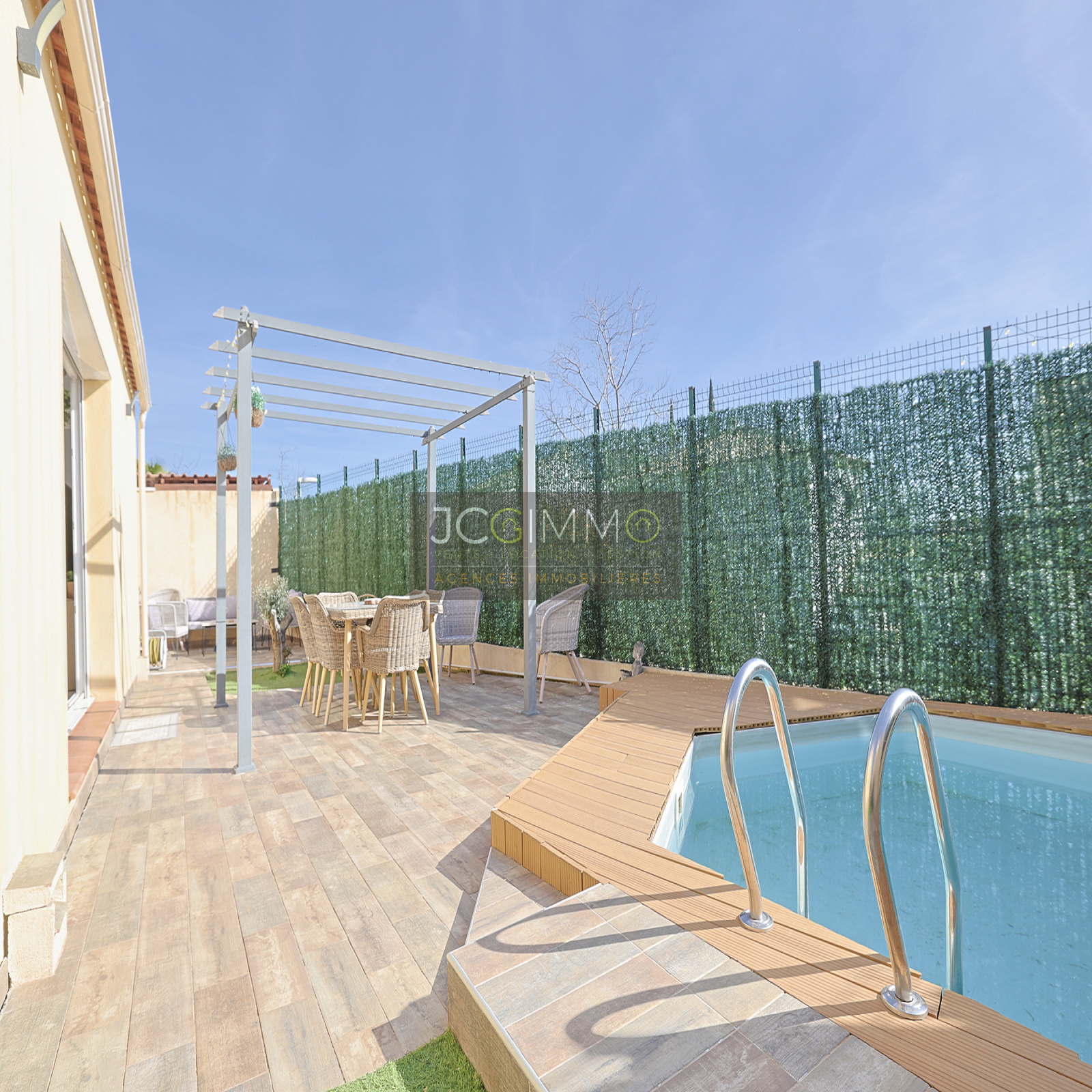 À l'extérieur, 1 Place de Stationnement, 1 Garage carrelé et isolé avec Mezzanine communicant avec le salon, Environ 70m² de Terrasse et une Piscine hors-sol hexagonale 3,5/3.