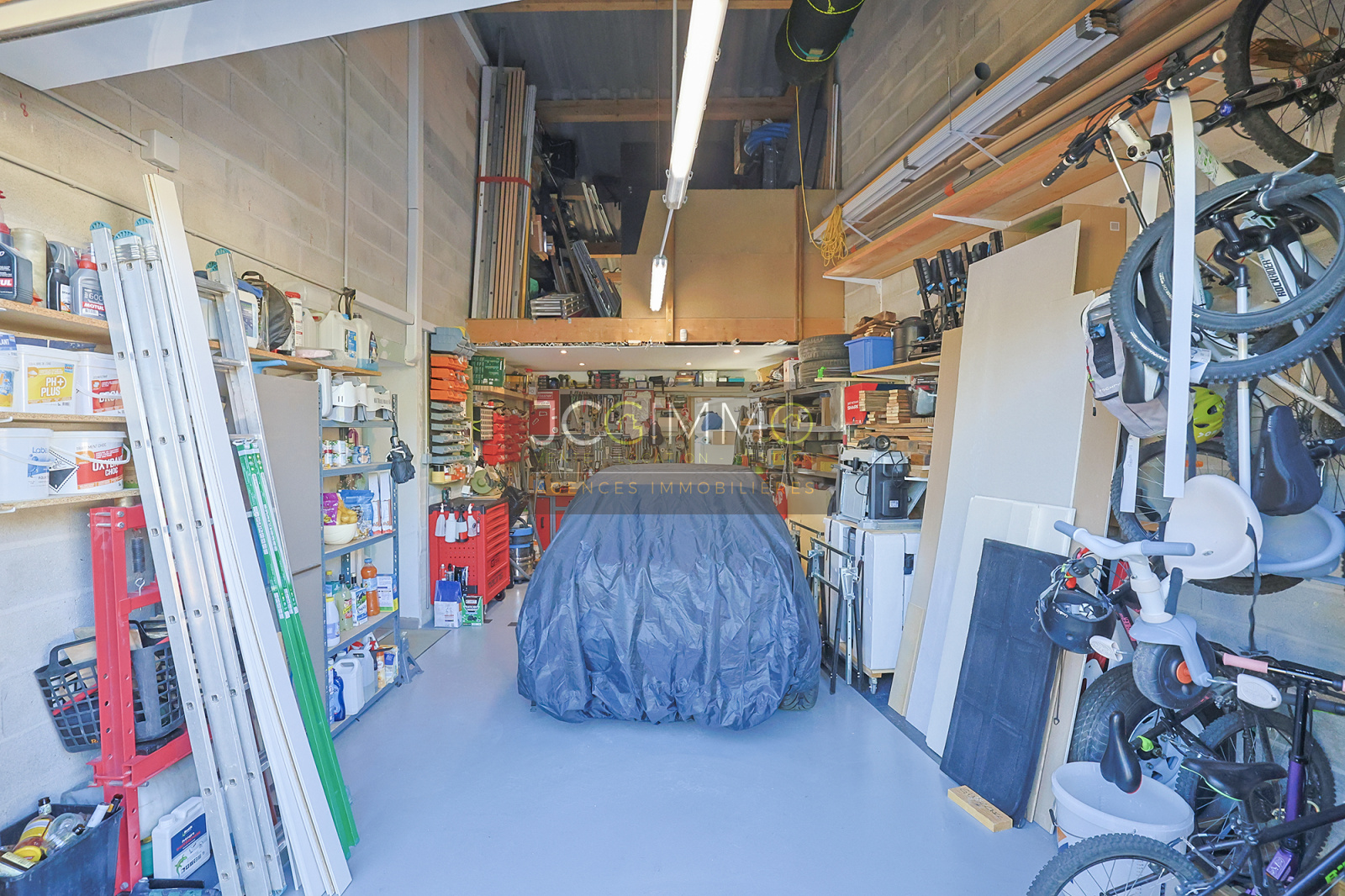 Au rez-de-chaussée : une entrée avec placards, un wc indépendant, puis, la pièce de vie comprenant salon, salle à manger et cuisine ouverte. L'ensemble communiquant avec le garage, sa mezzanine et une buanderie.