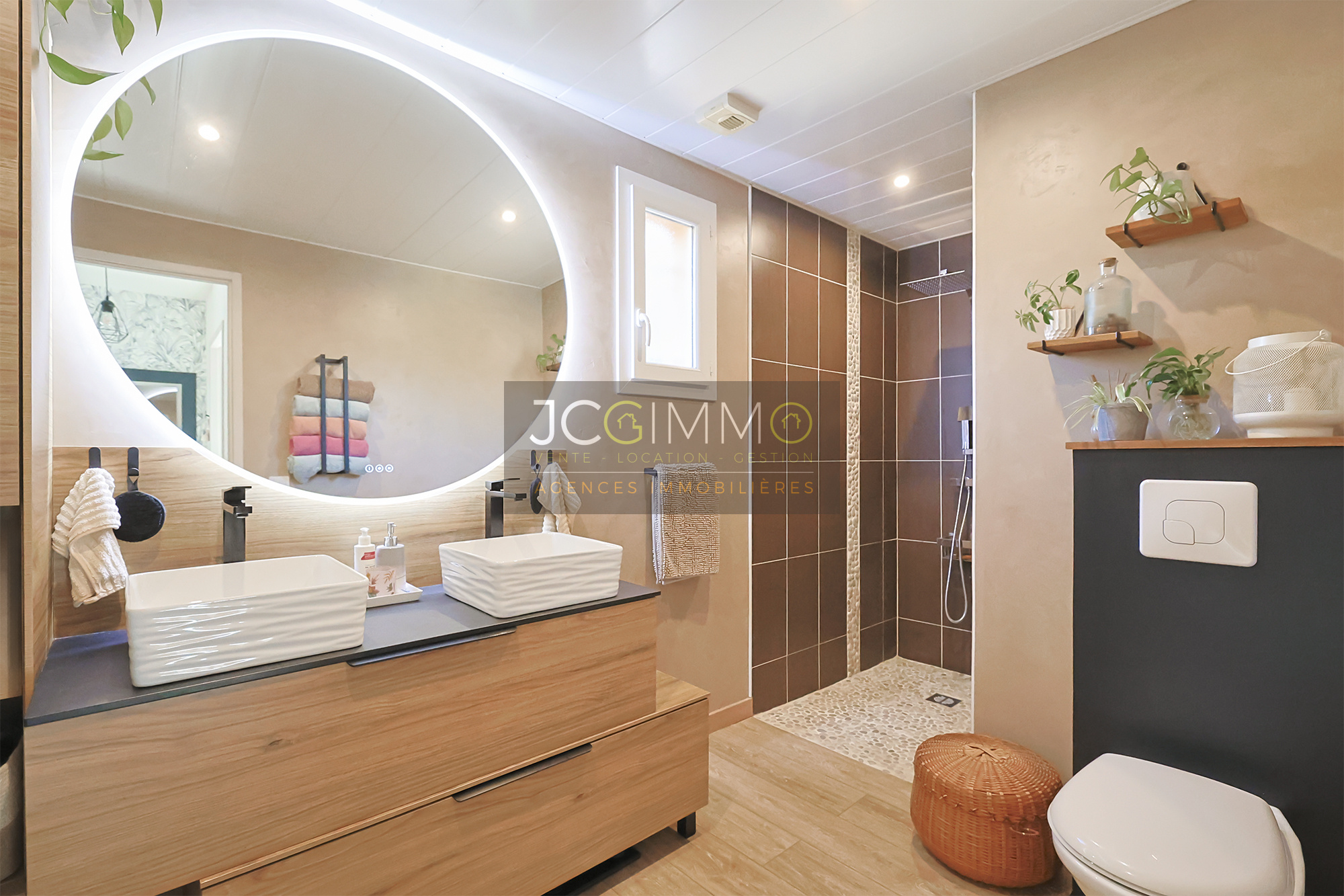 Prestations de qualité : panneaux solaires pour l'autoconsommation installés en 2021 / Aucune anomalie électrique / Combles réisolés / Chauffage : poêle à bois et climatisation réversible dans la pièce de vie + climatisation gainable pour l'intégralité de l'étage / Menuiseries : volets roulants solaires, baie à galandage en aluminium entre le séjour et la terrasse + double vitrage en PVC sur l'ensemble du bien.