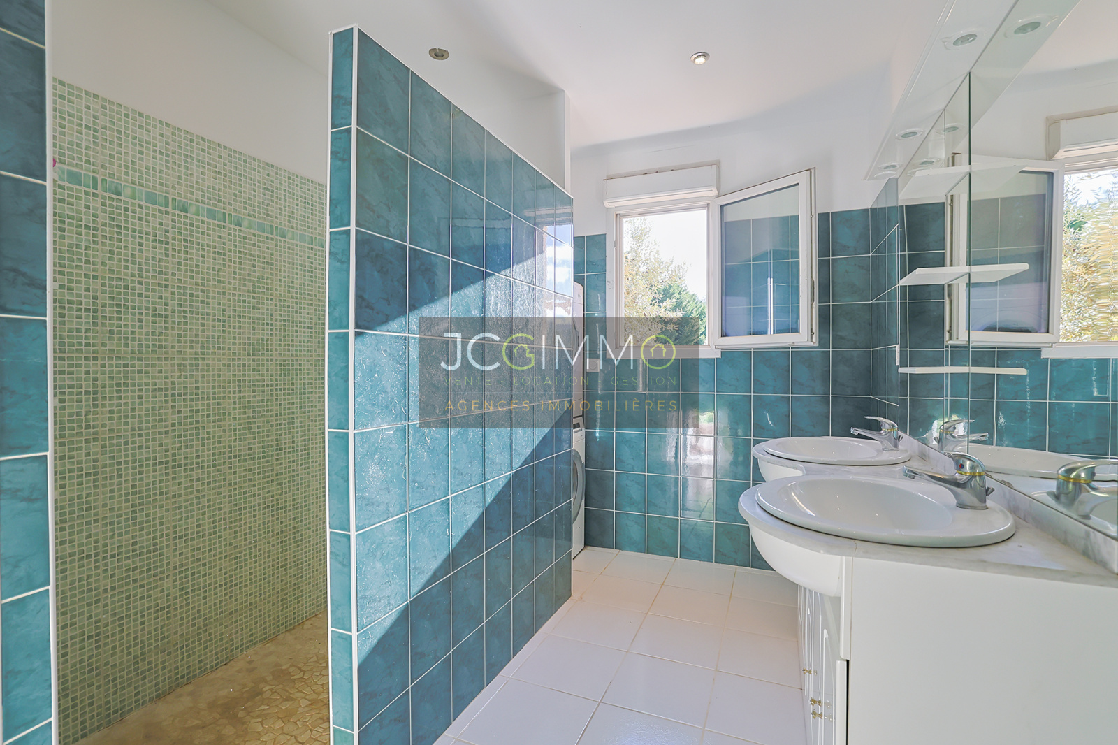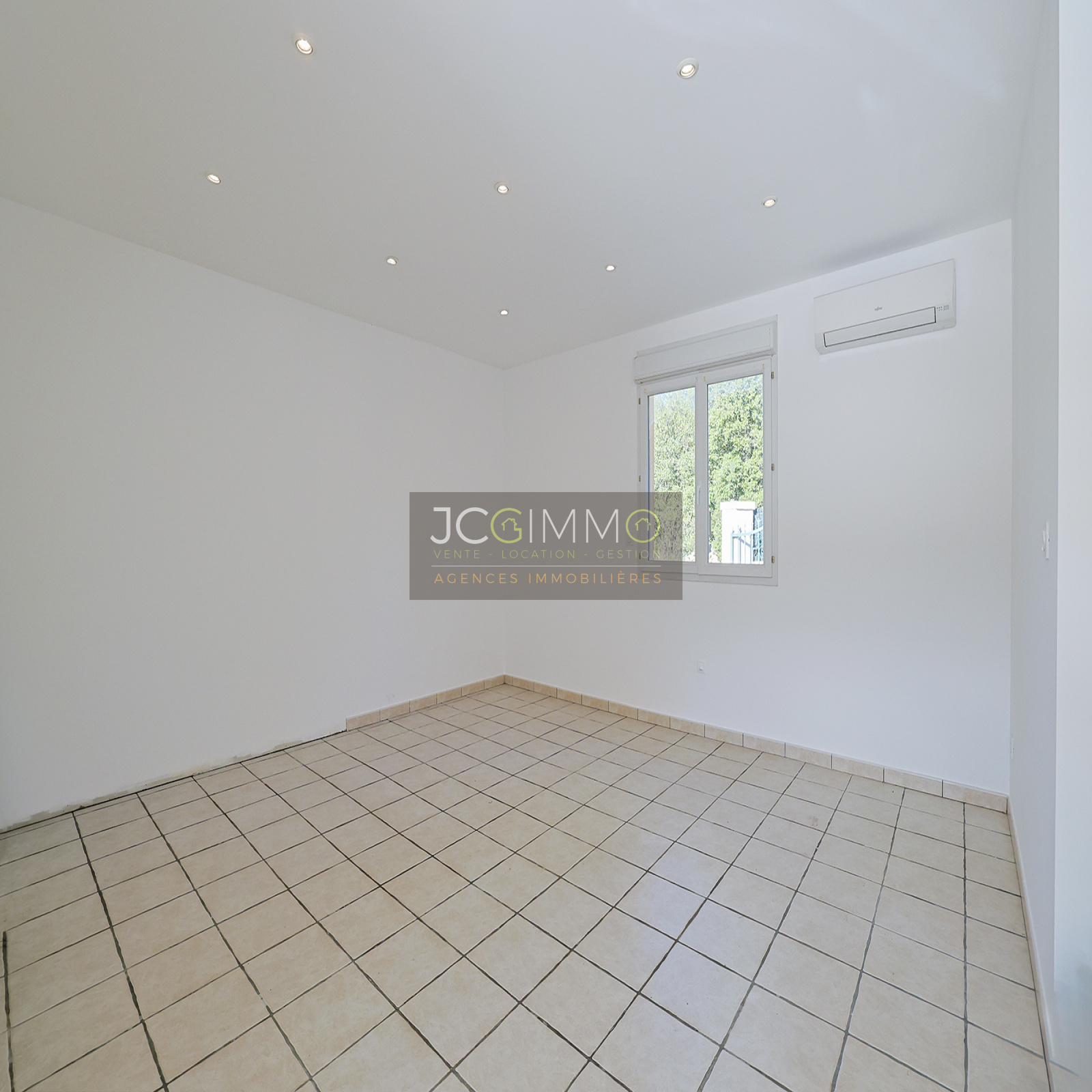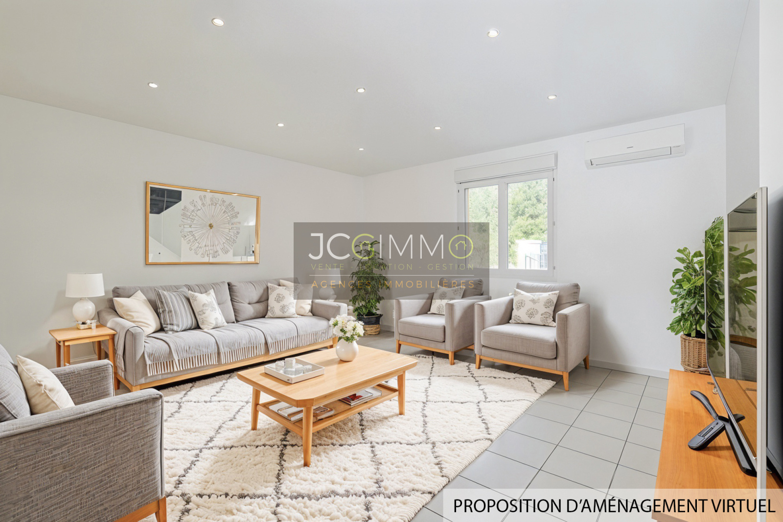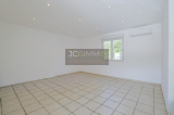 A l’INTERIEUR : une cuisine américaine ouverte vers un grand salon/séjour lumineux et climatisé, trois chambres avec rangements, salle d’eau avec douche italienne, WC séparé.