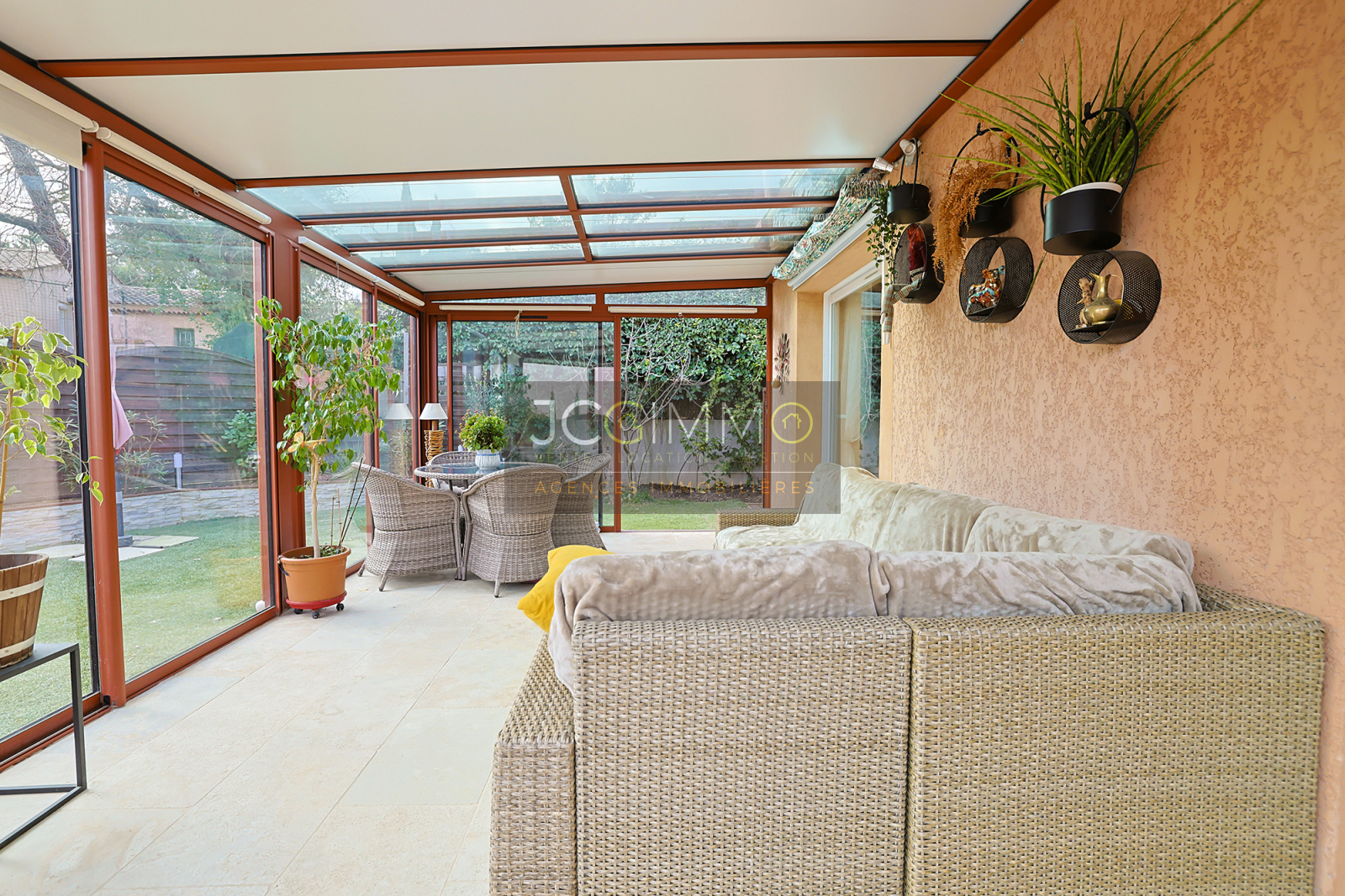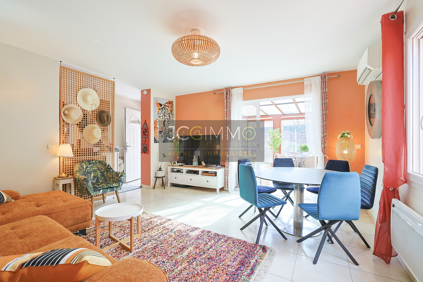 Intérieur : une entrée avec placard, donnant sur un séjour lumineux avec sa cuisine ouverte, l'ensemble complété par 20m² de véranda.