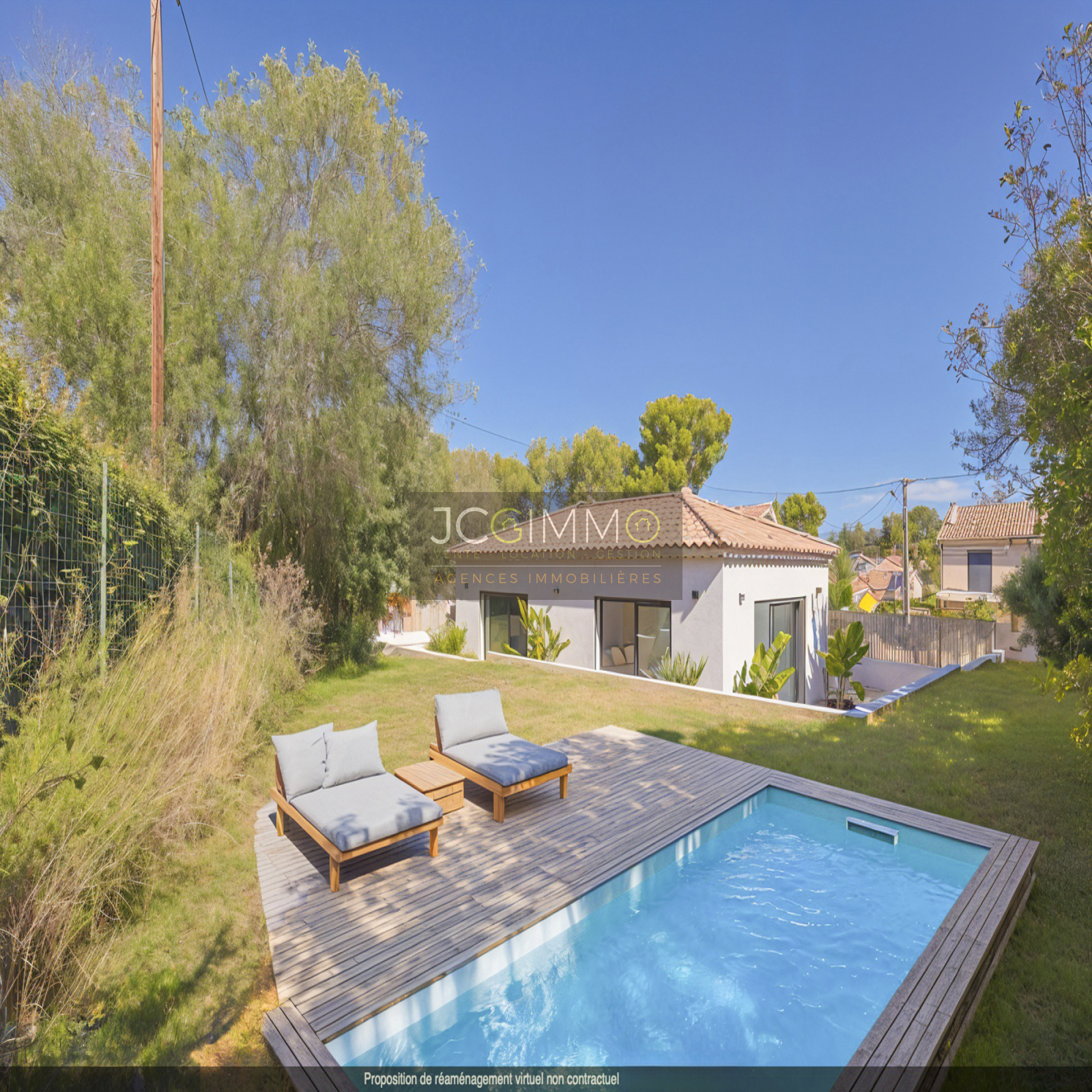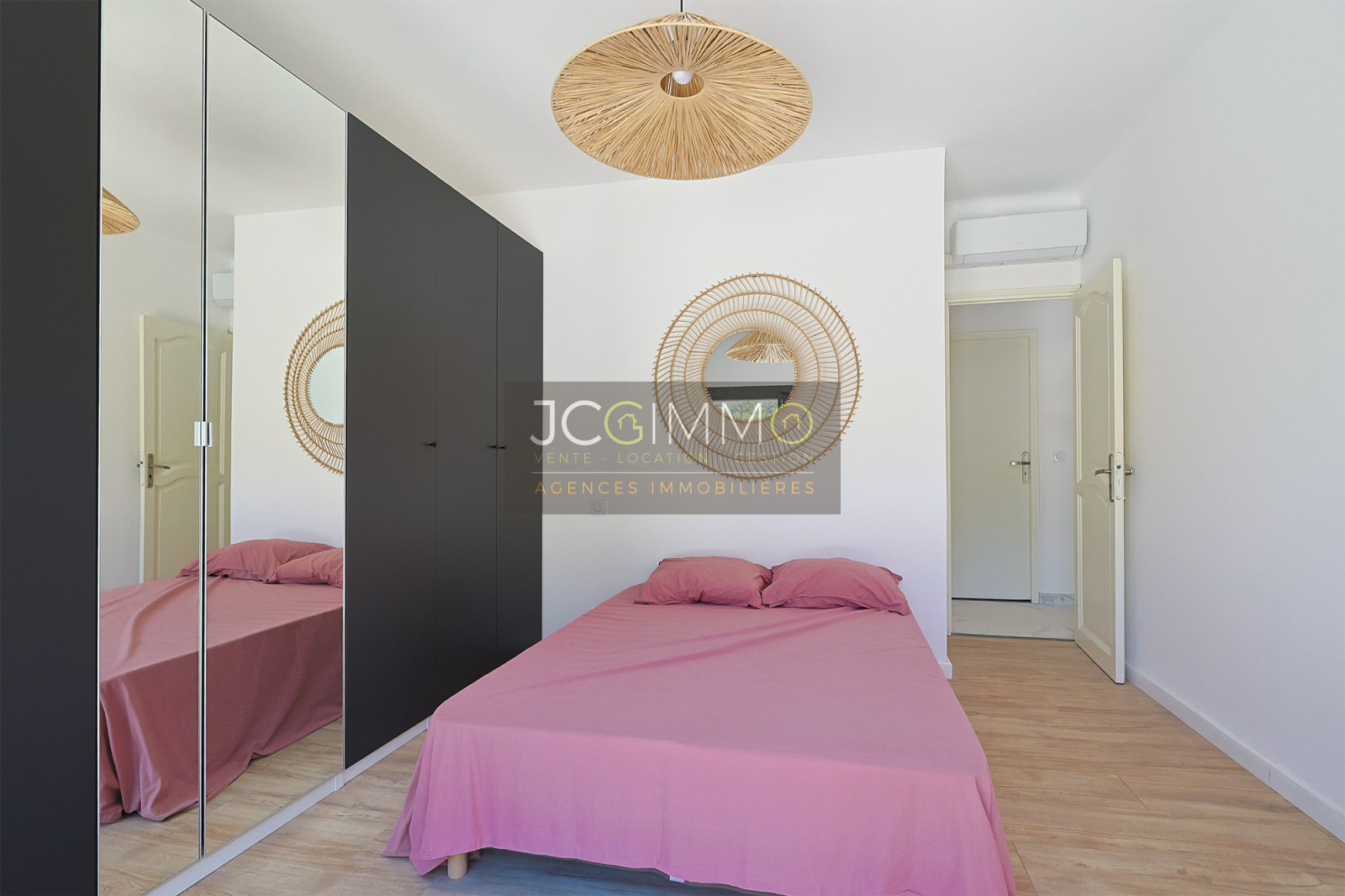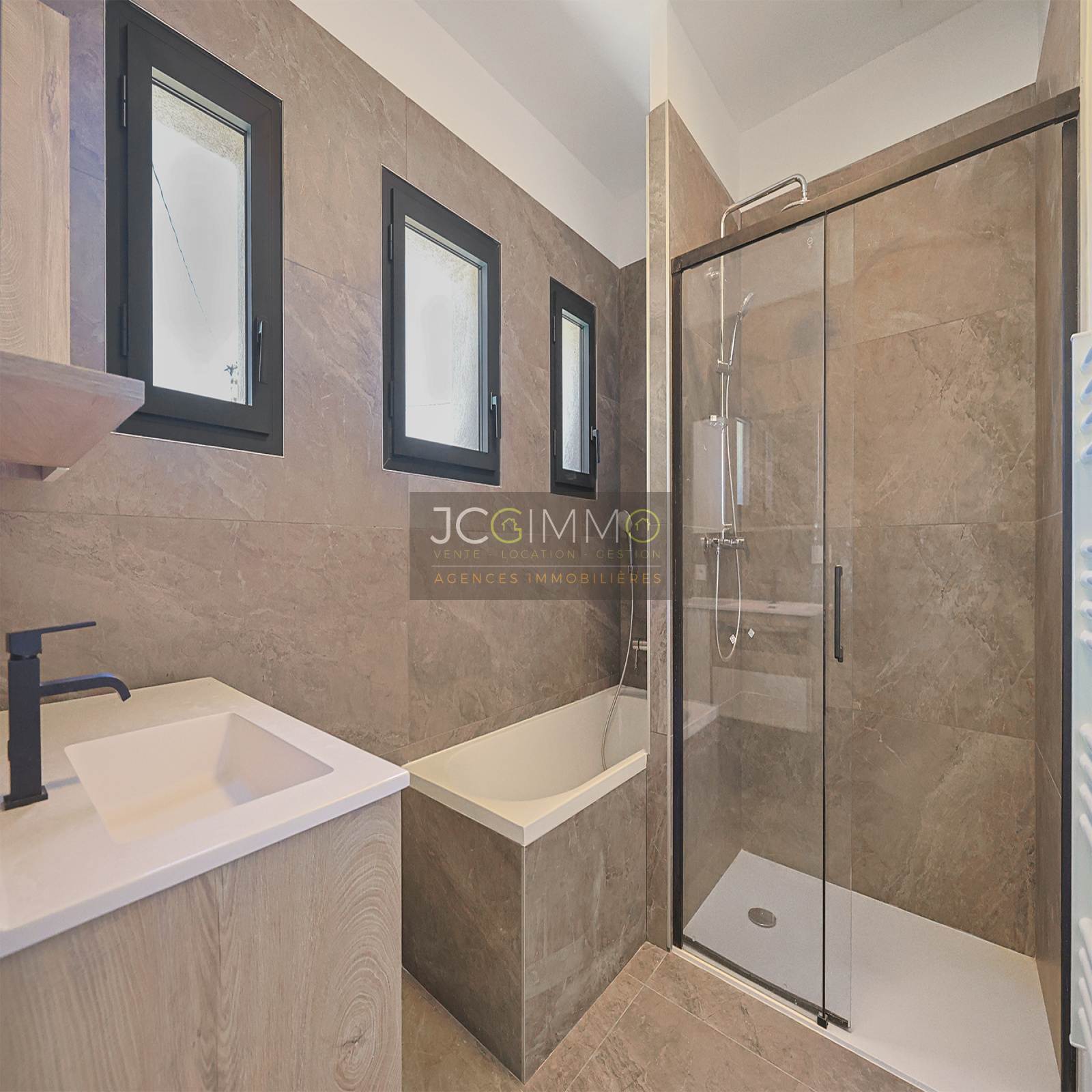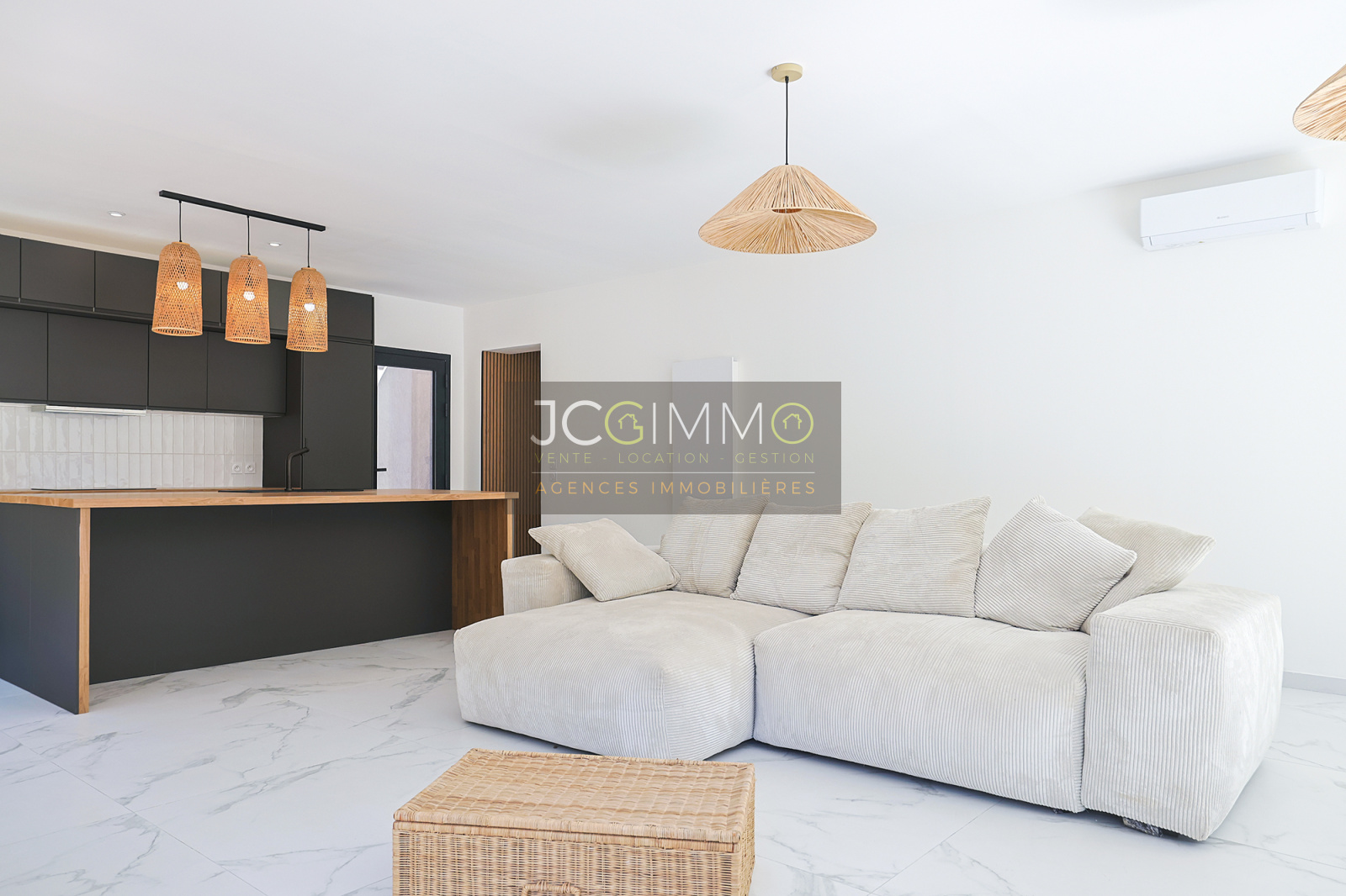 Prestations premium : climatisation réversible dans toutes les pièces, double vitrage coulissant en aluminium avec volets roulants, carrelage grands formats, finitions soignées. Aucun vis-à-vis, pas de travaux à prévoir.