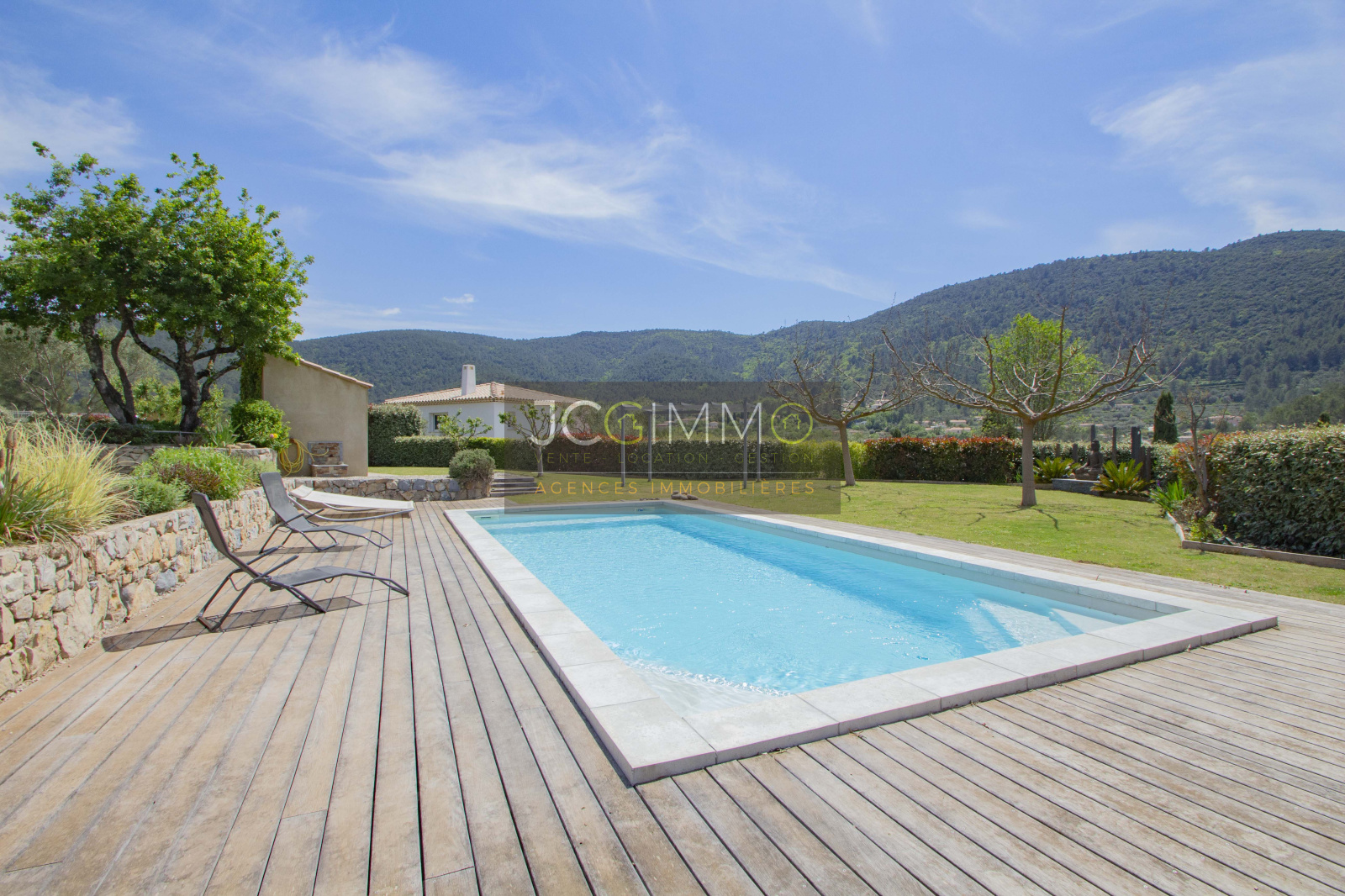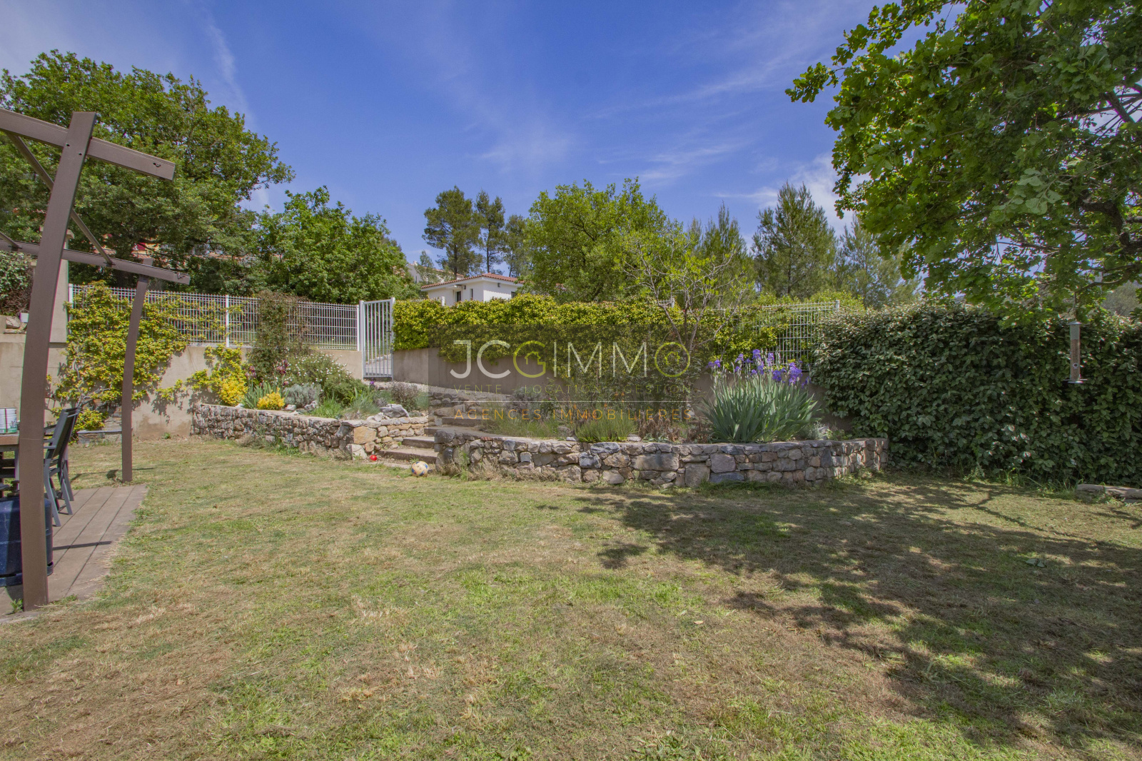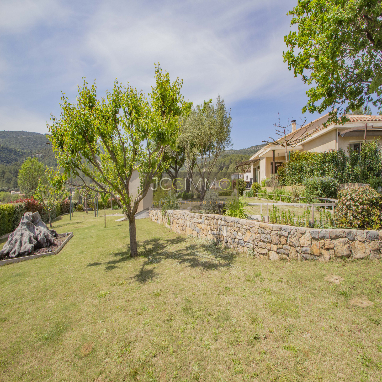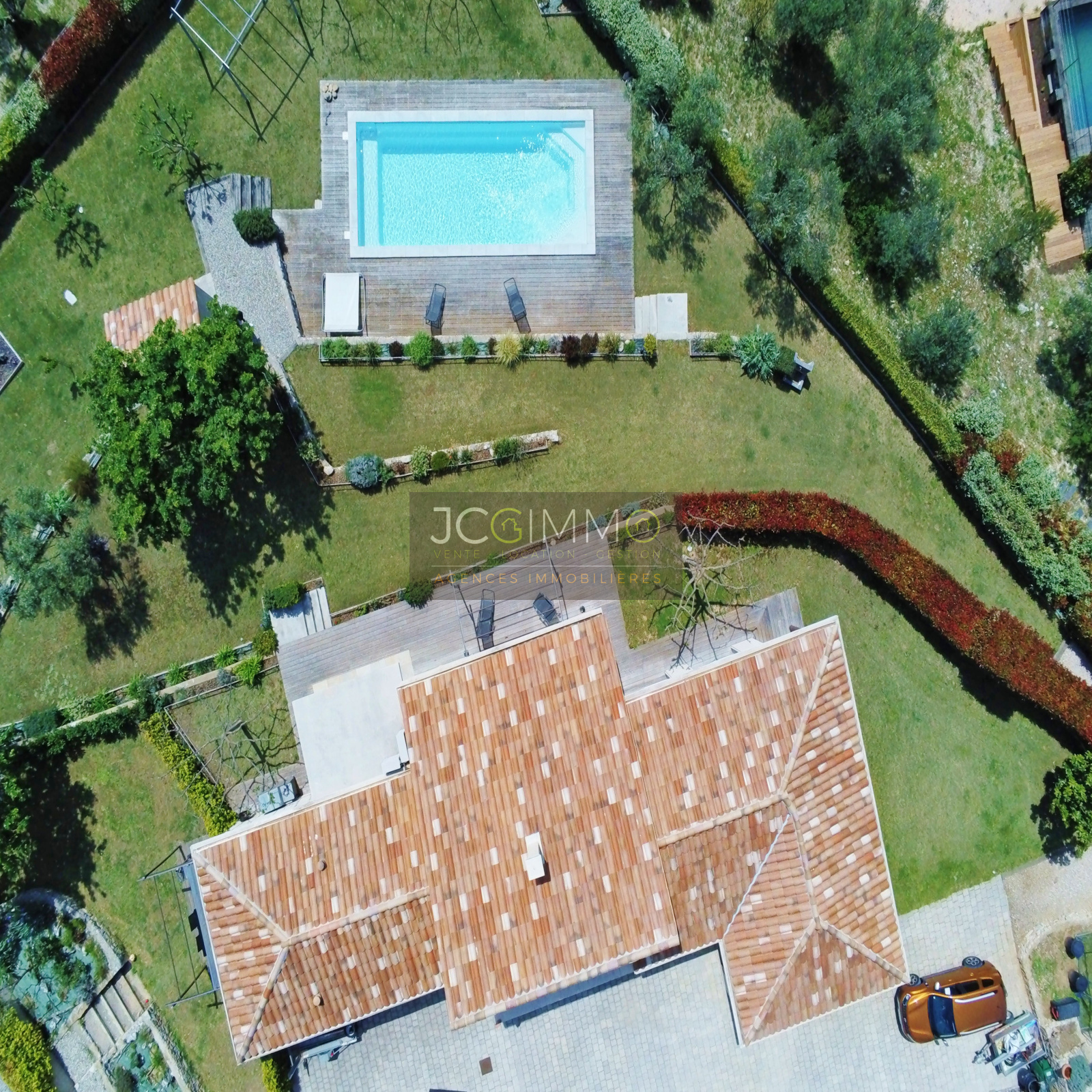 Le terrain, entièrement clos de 2000 m² en pente très douce, est parfaitement aménagé avec piscine, local technique et garage attenant (aménageable bureau, chambre ...).