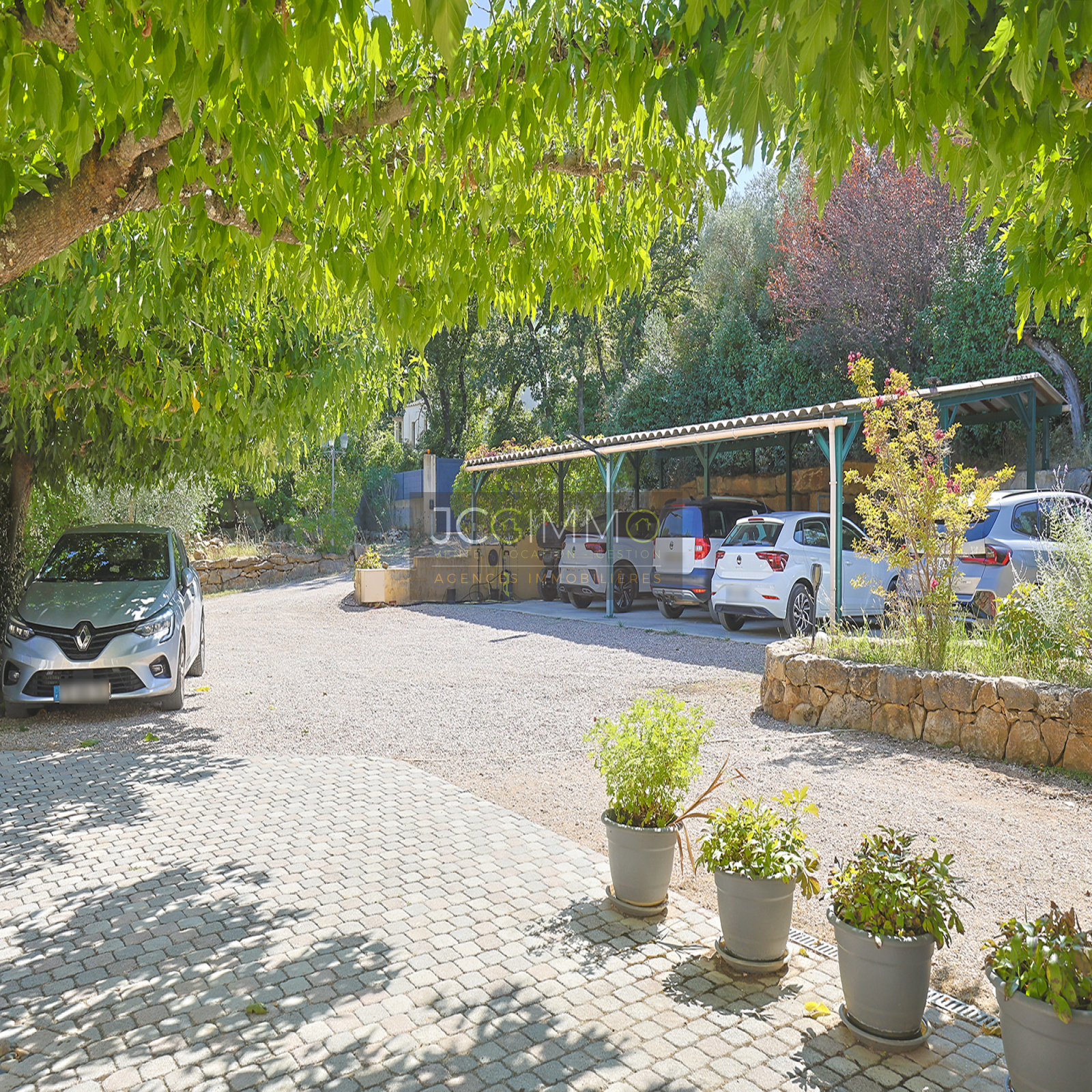 Dès l'entrée sur la parcelle de 3600 m², une grande aire de stationnement vous accueille disposant de plusieurs places de parking dont un grand abri (74 m²) pouvant mettre à l'abri (du soleil !) jusqu'à 4 véhicules mais également camping-car ou encore bateau .....