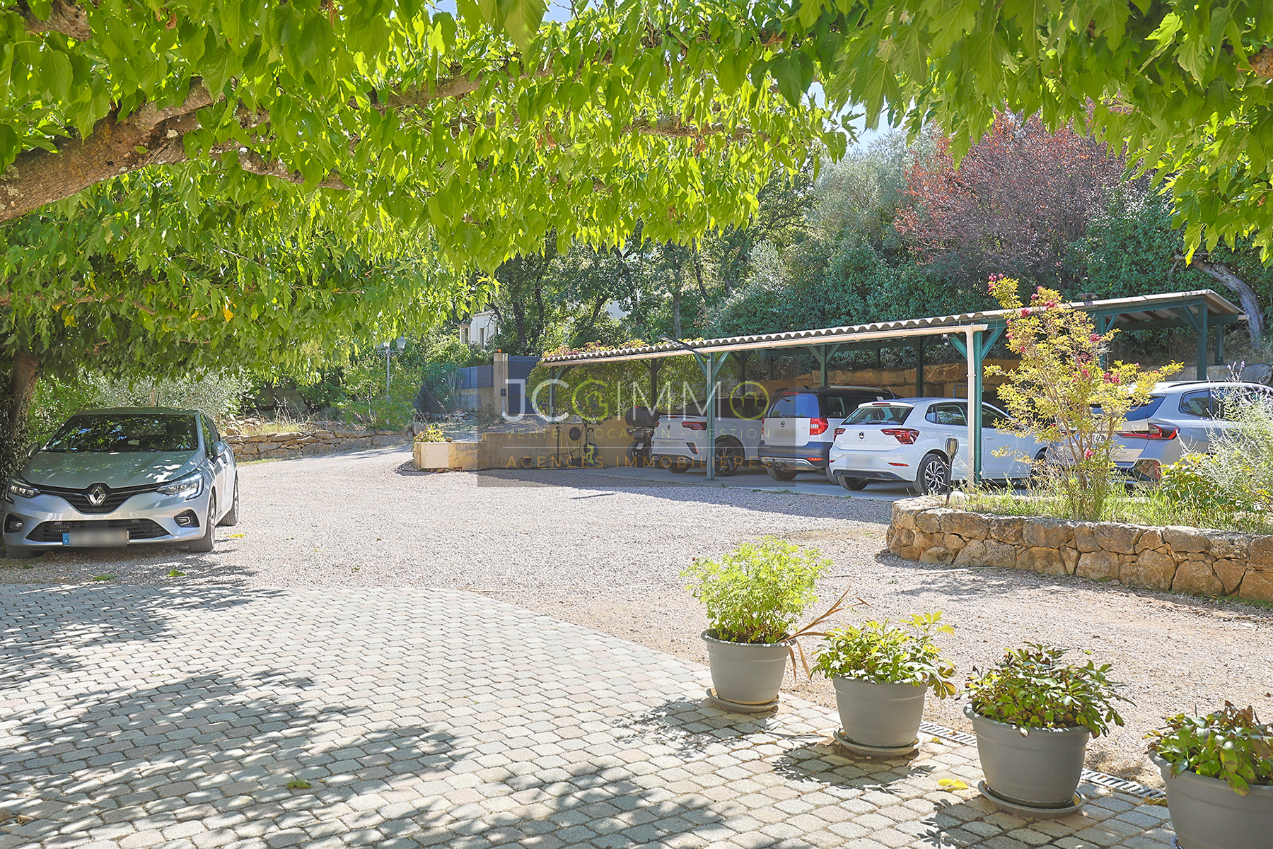 Dès l'entrée sur la parcelle de 3600 m², une grande aire de stationnement vous accueille disposant de plusieurs places de parking dont un grand abri (74 m²) pouvant mettre à l'abri (du soleil !) jusqu'à 4 véhicules mais également camping-car ou encore bateau .....