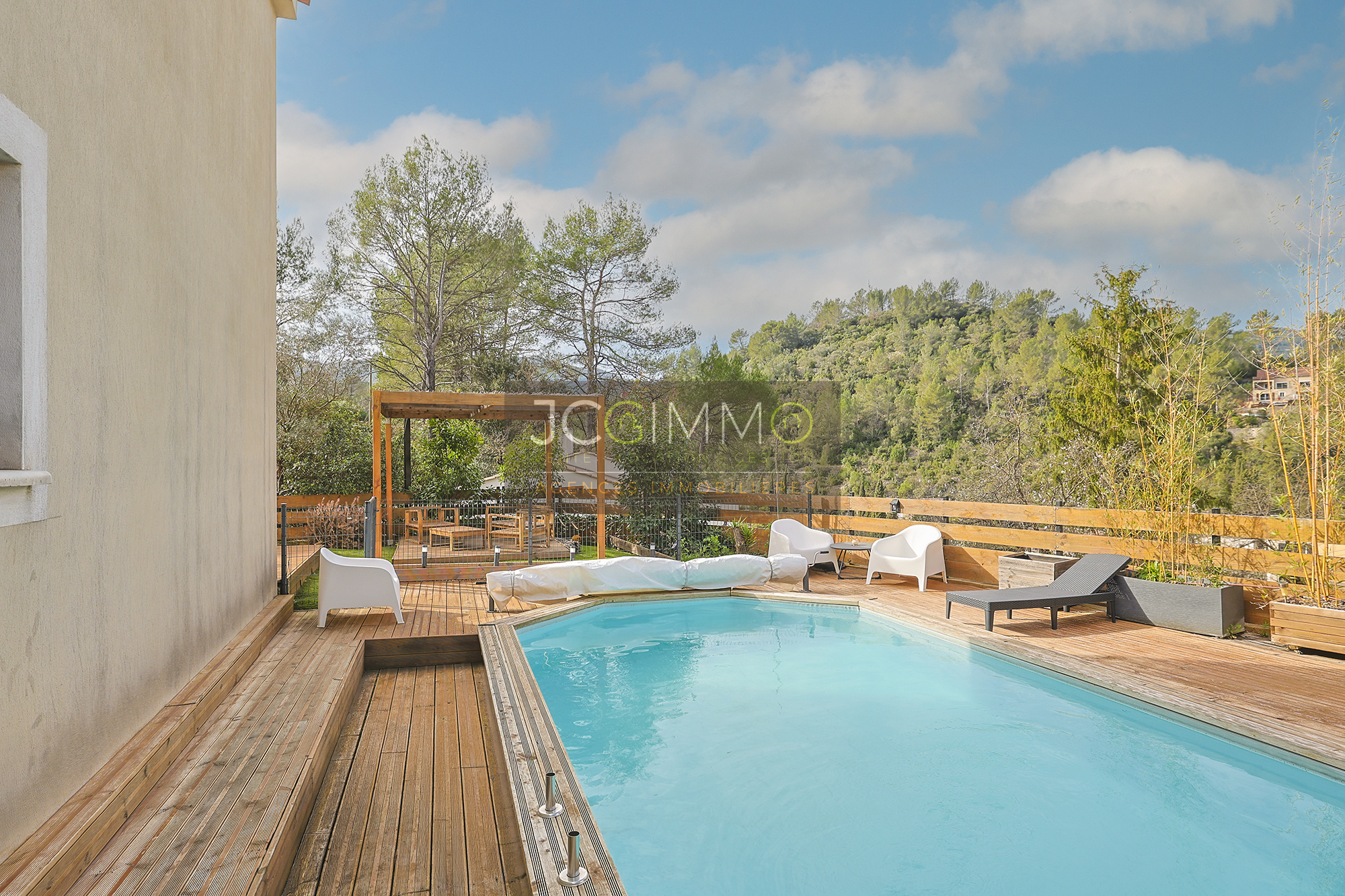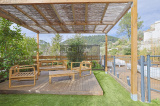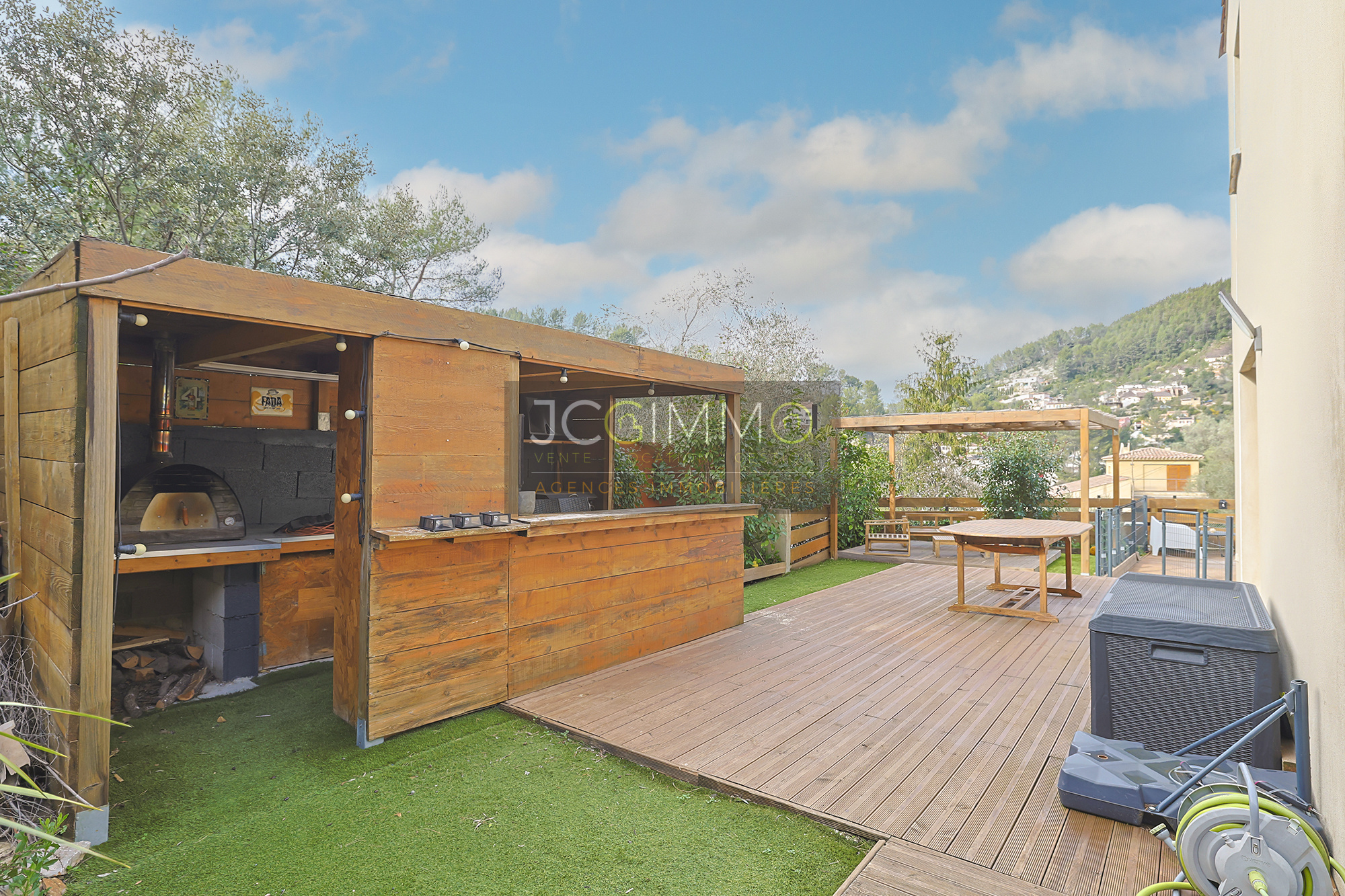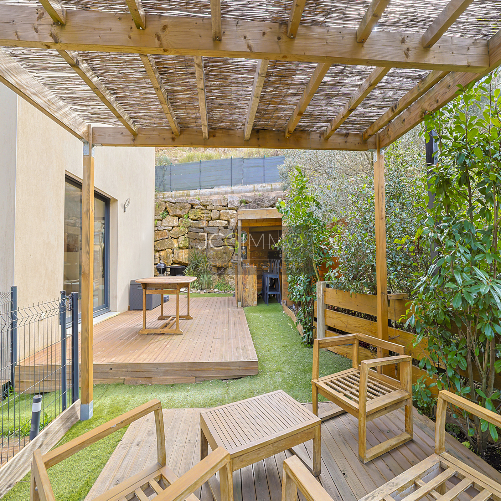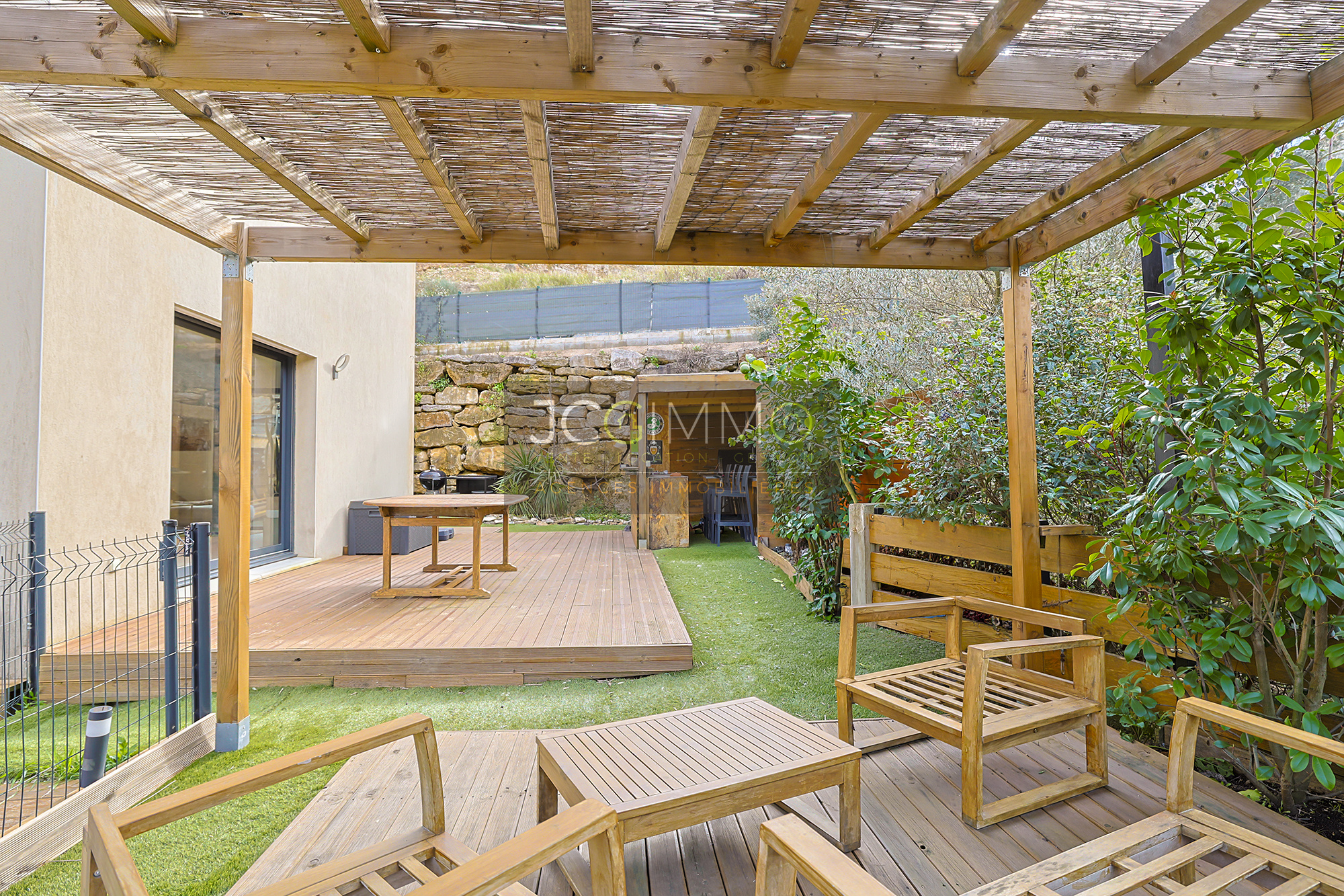 - Un espace repas avec sa pergola et sa terrasse en bois.