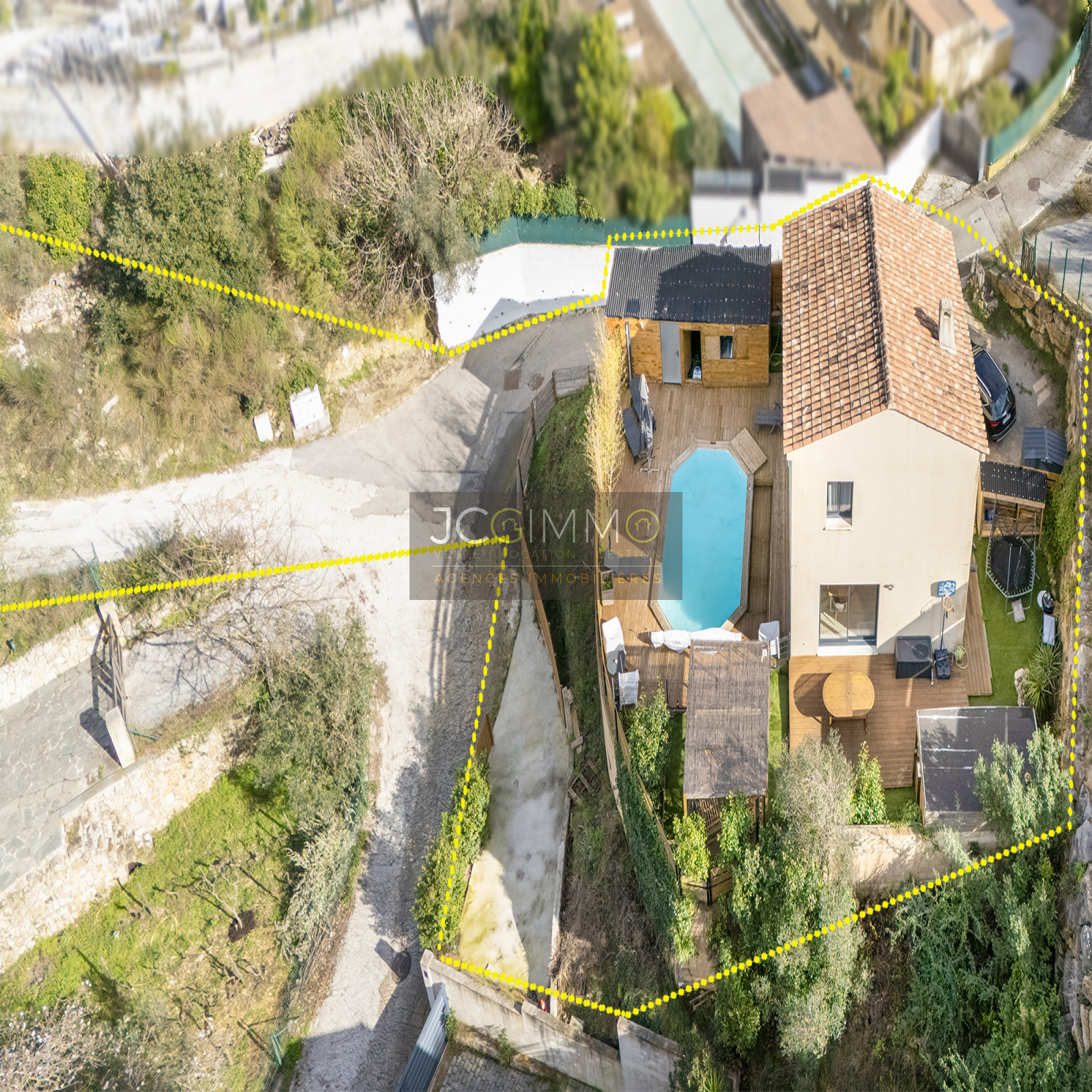 Le terrain d’environ 500 m² clôturé (parcelle cadastrale 962 m²) est organisé en plusieurs espaces de loisirs et de détente :