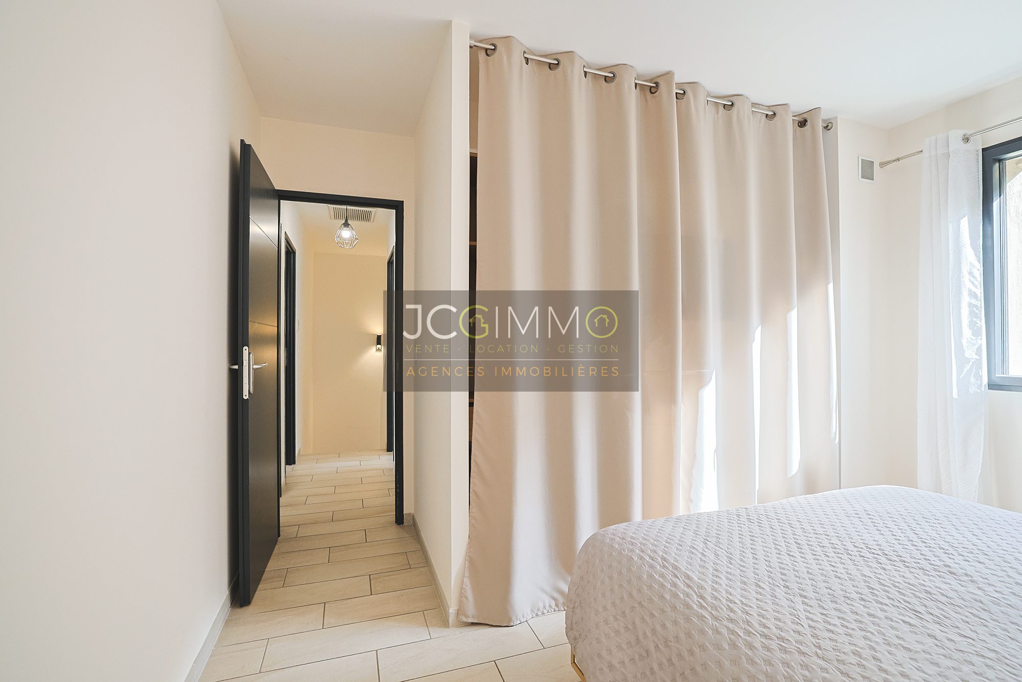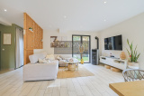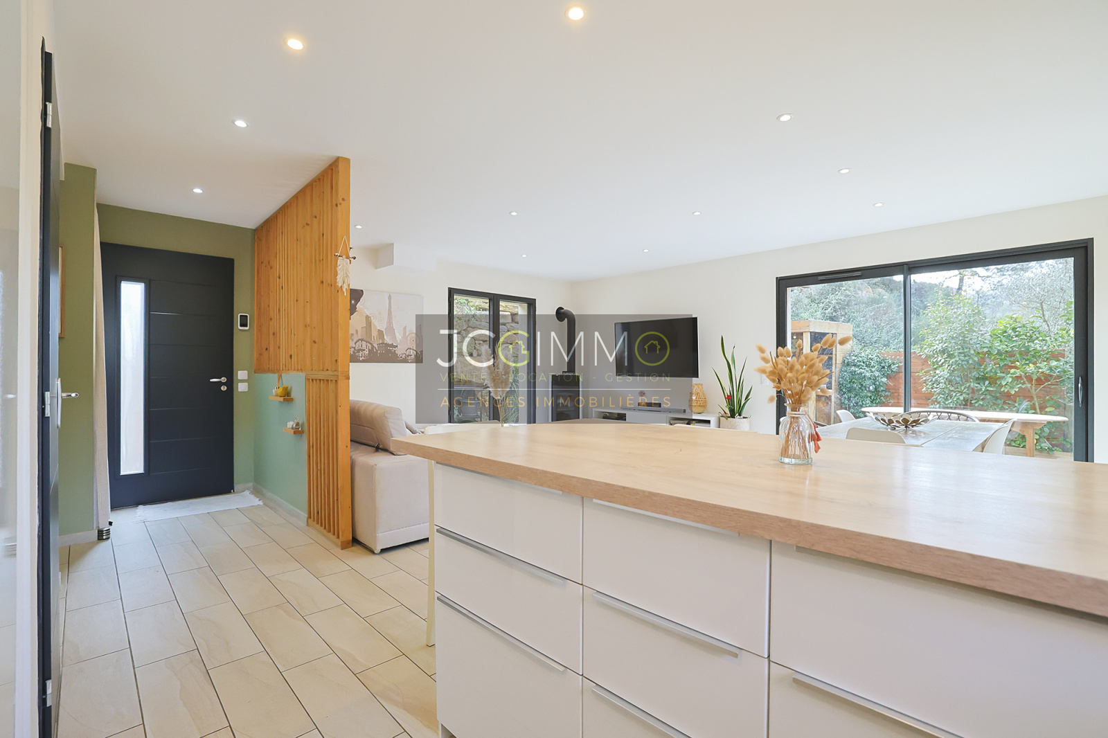 - Une entrée avec placard, bien définie par un claustra, distribue une pièce de vie (salon, salle à manger et cuisine) de 42 m², baignée de lumière grâce à ses 2 baies vitrées