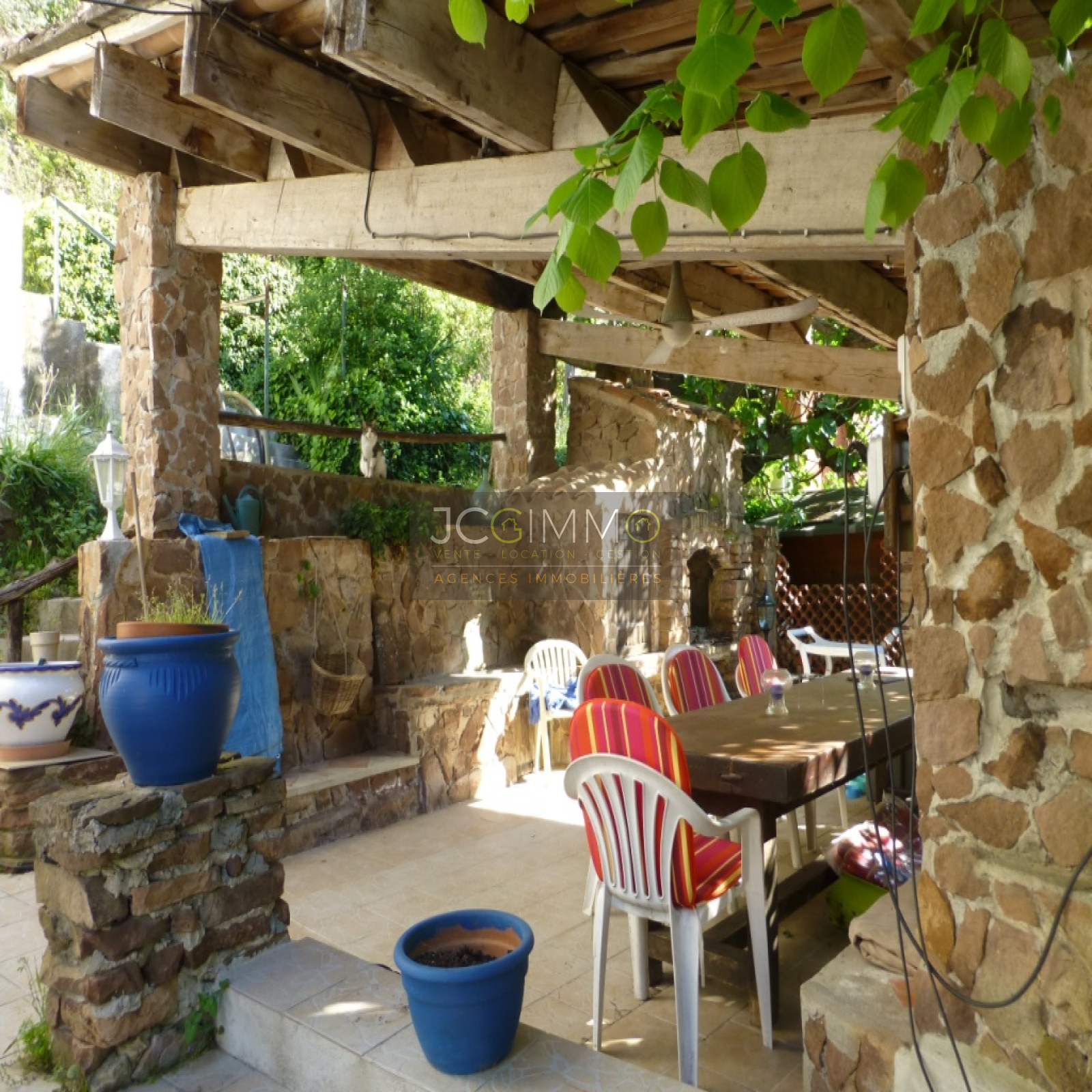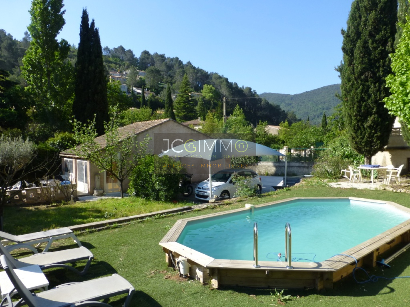 SOLLIES TOUCAS. Secteur résidentiel recherché, au Calme, Ensoleillé toute l’année, avec Vue Dégagée. Villa T4 103 m² env. des années 60 avec garage intégré + Maison T3 PLAIN PIED 50 m² récente et séparée (Salon + cuisine équipée + 2 chambres + Salle de douches/WC + mezzanine + terrasse privée). Espace Piscine 7x3.5m (semi-enterrée). Terrasse couverte (21 m²) avec Barbecue. Le tout sur un Terrain en restanques de 1048 m² clos avec portail motorisé et Abri voitures.