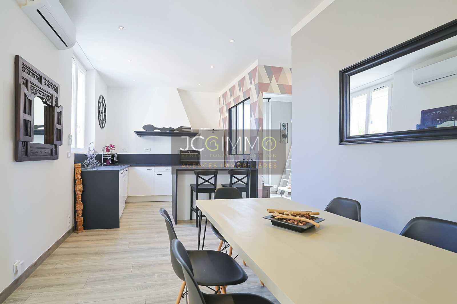 PRESTATIONS : Toiture entièrement révisée (2020), cuisine aménagée et équipée (lave-vaisselle, plaques induction, four/micro-ondes, hotte avec extraction), salle de bains/eau aménagée et équipée (double vasque, radiateur sèche serviettes), huisseries PVC avec double vitrage, ouverture oscillo-battante (cuisine), stores roulants électriques SOMFY, climatisation réversible révisée en mars 2025 (espace de vie cuisine/salle à manger), radiateurs à inertie sèche (pierre réfractaire) pour les 2 chambres, VMC, chauffe-eau électrique 200 L (novembre 2024), eau de ville, tout à l’égout.