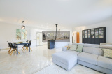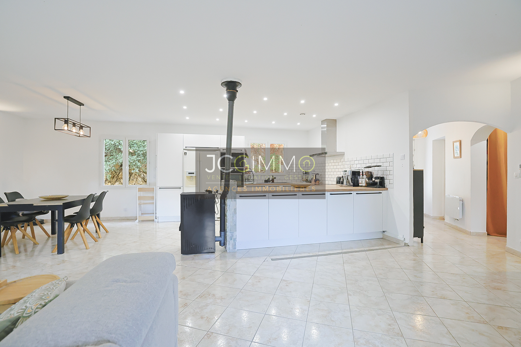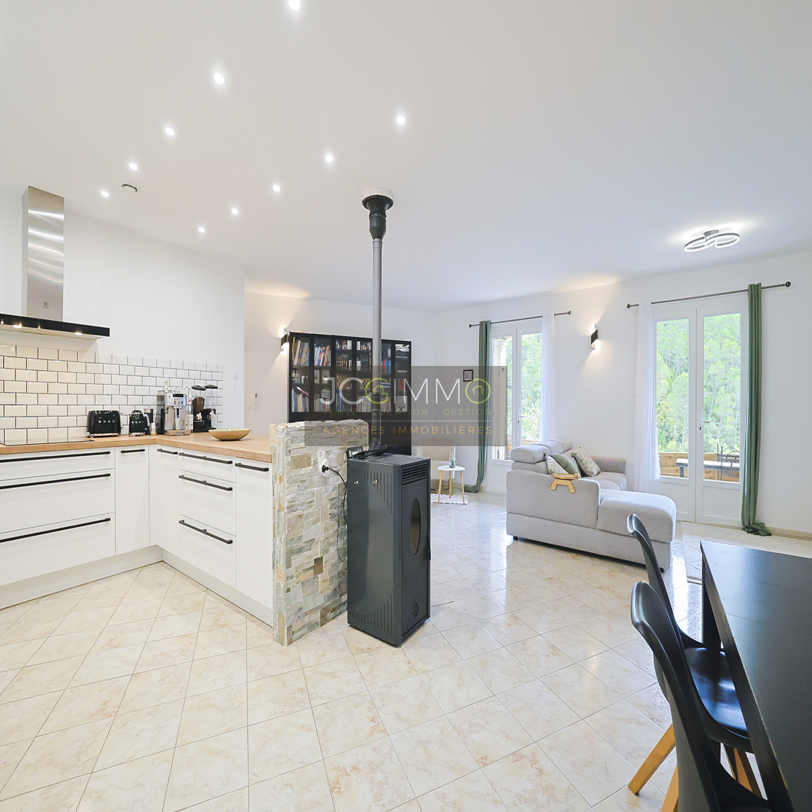 À l'intérieur : une entrée donnant sur un séjour climatisé de 52m² avec cuisine moderne équipée, poêle à granulés et portes-fenêtres s'ouvrant sur une terrasse couverte avec bbq et vue dégagée sur une zone boisée.