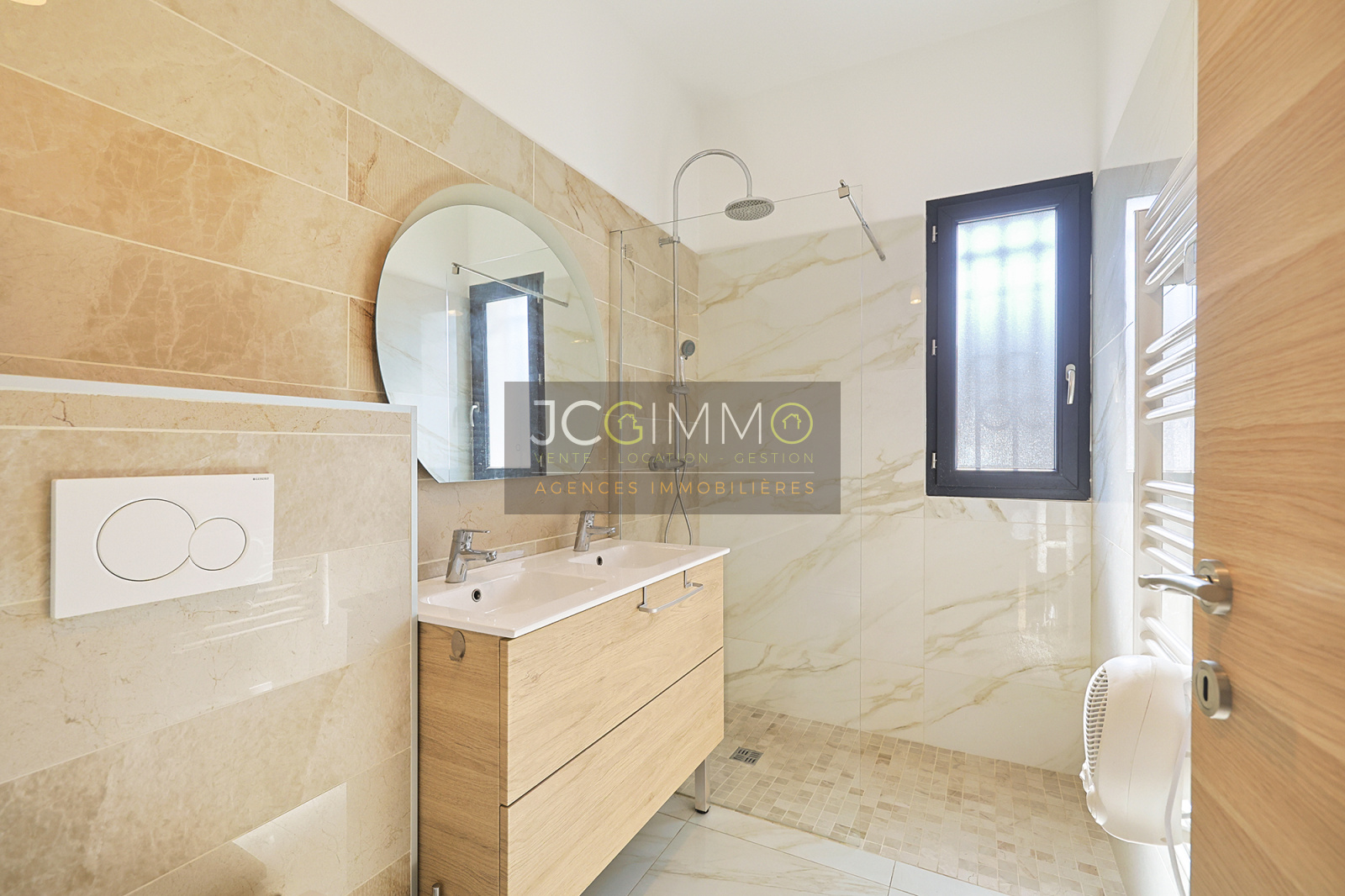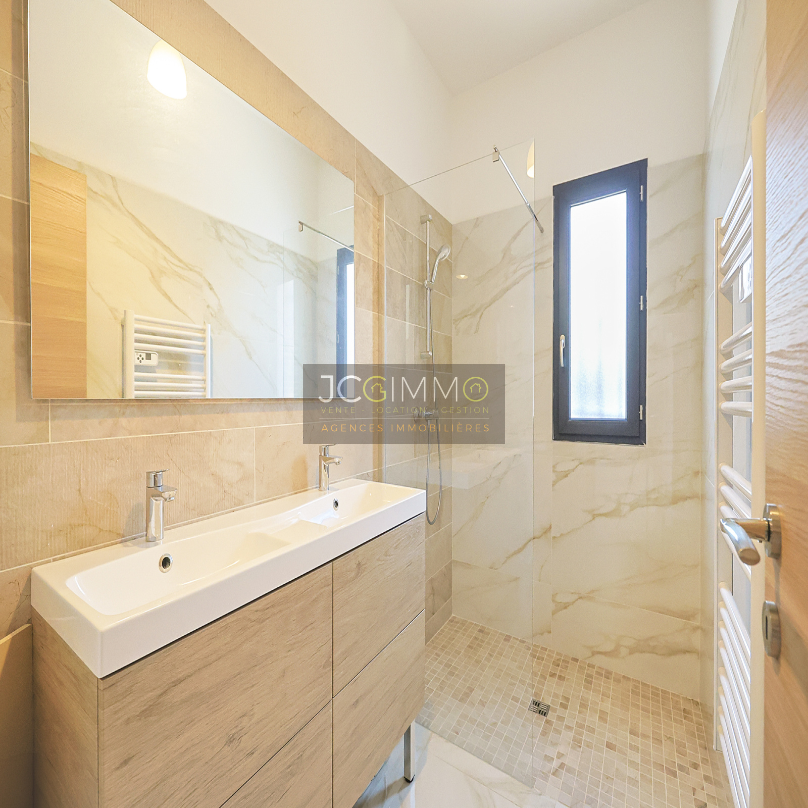 Le bien comprend également une suite parentale, soit une pièce équipée d'un placard, d'une douche, d'une double vasque et d'un WC, cette première chambre s'ouvrant directement sur le jardin.