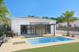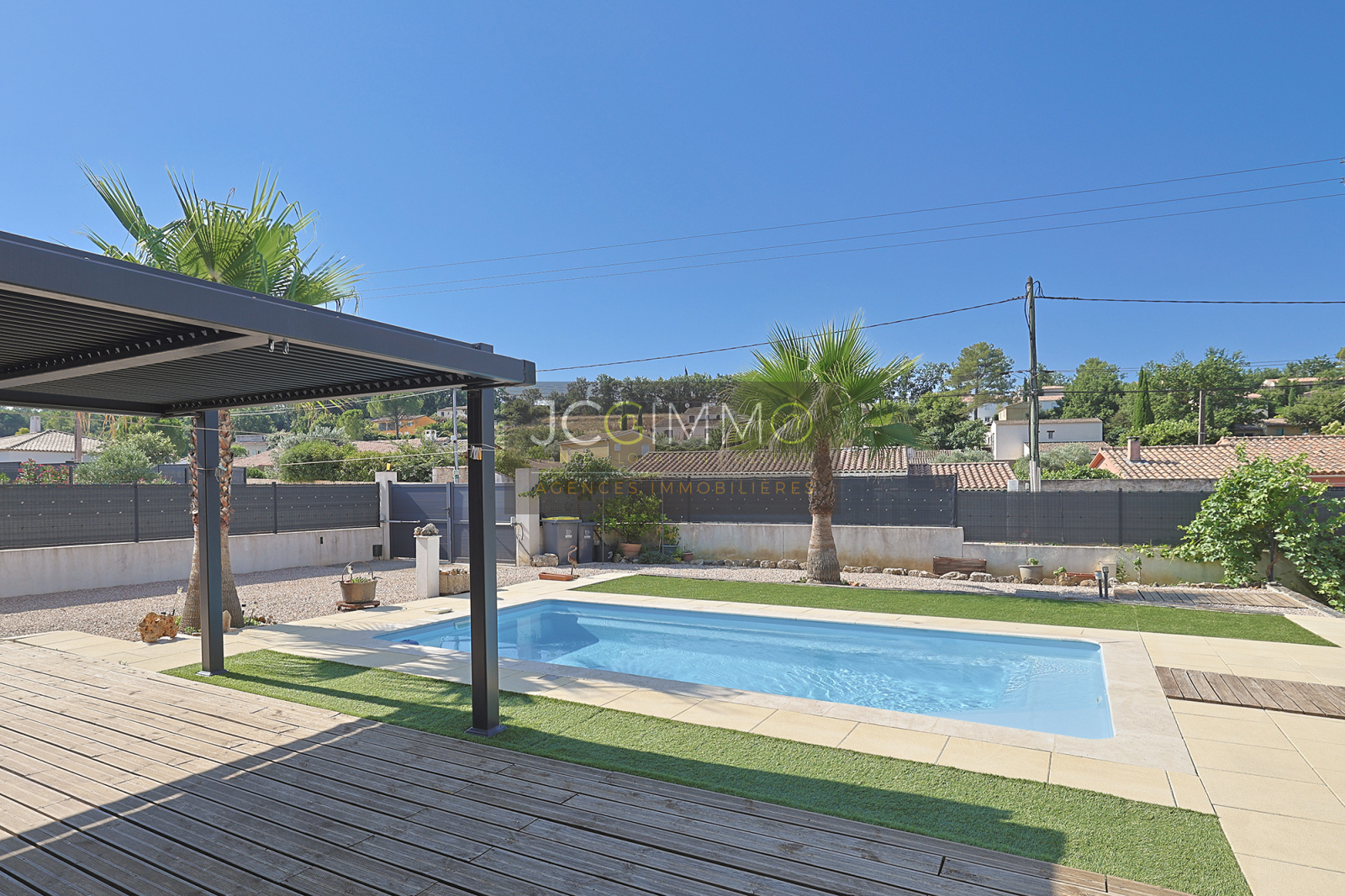 L'ensemble du séjour s'ouvre sur l'avant de la propriété avec notamment l'espace terrasse équipé d'une pergola bioclimatique, d'une piscine coque 6/3 chauffée avec système de nage à contre-courant et des plages entourant le bassin.